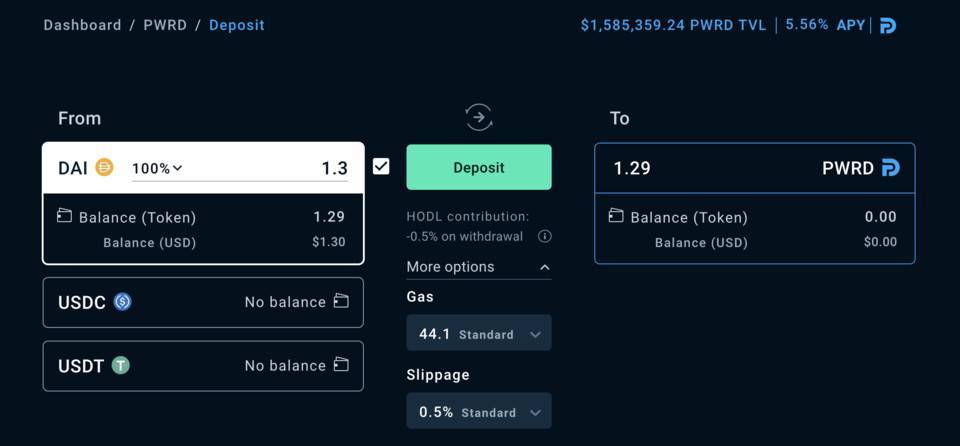 Vault 会在获得更高收益的同时,需要承担 Vault 和 PWRD 两类产品的所有风险。PWRD 是一种低风险储蓄产品,在存入上述三种稳定币后用户可以收到名为 PWRD 的代币份额,另一方面,PWRD 也能向其他稳定币一样作为交换媒介来发送和消费。