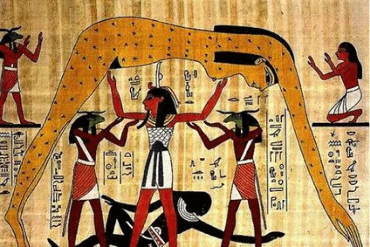 他们并不知道那些看似临近的星,距离可达几亿光年。平面化的解析似乎是所有远古文明的共性,古埃及人亦然。埃及神话九神柱之一的努特女神,呈现出星辰遮身,手足撑地,弓着身子,罩在大地的样子。
