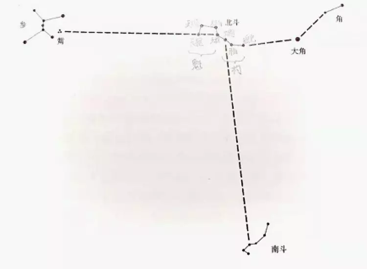 如图可示。杓的延长线最终指向苍龙七宿的角宿;天权指向天枢的延长线指向白虎七宿的觜(zī)宿;从玉衡引出平行于天玑、天权连线的的平行线,则指向南斗六星。