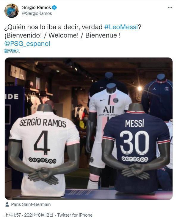 不仅仅如此,拉莫斯还发了两人球衣合影,然后@了梅西:“谁能想得到呢?欢迎你!”拉莫斯这句“欢迎”,选择了西班牙语、法语和英语这三种语言,这也体现了“水爷”是由衷的欢迎梅西加盟,他也用这种方式表达对梅西无限的尊重。