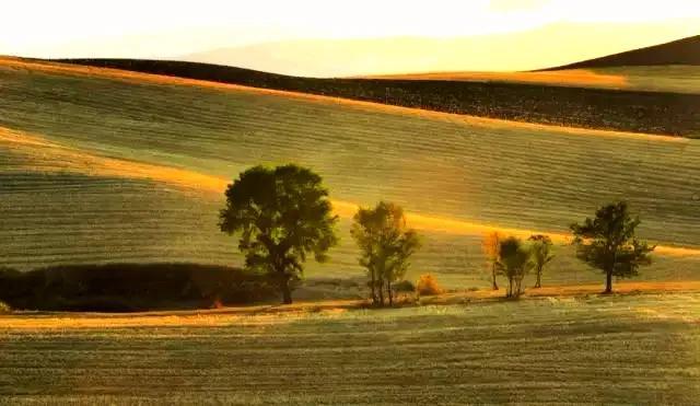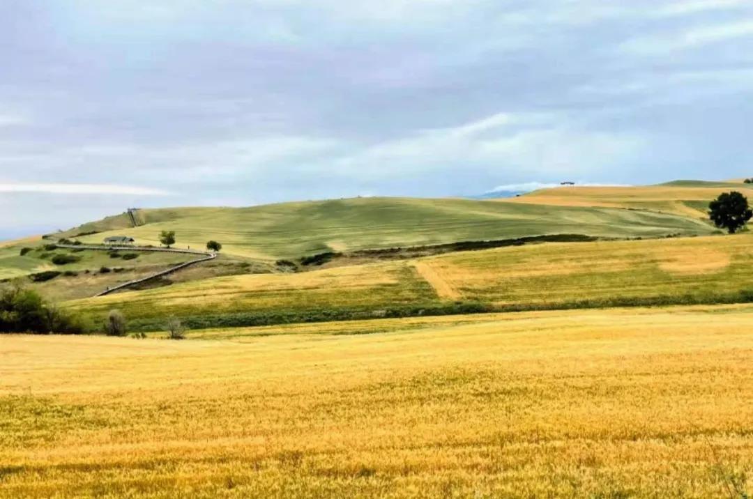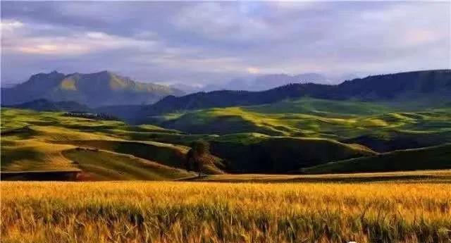 金黄色的麦田间点缀着几棵古朴的大树,旁边是牛羊和房屋与草原厮守与山林共饮。