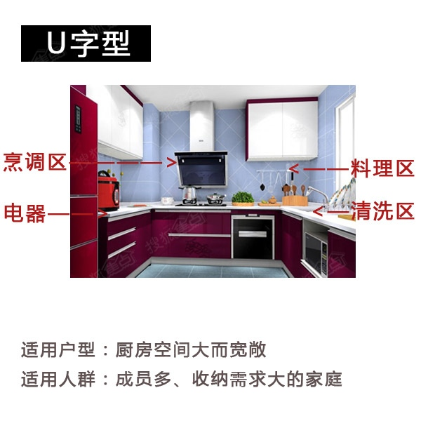 a.U型厨房在规划时,提前将空间合理安排,将水槽、灶台、工作台、冰箱沿墙面设计成U型。