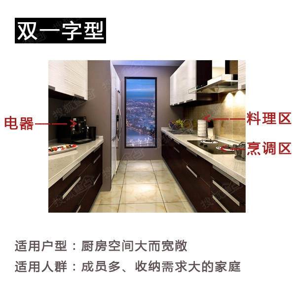 双一字型厨房布局:双一字型布局也称为二字型布局,它是沿着两侧的墙面进行对立布局。整个动线不会重复,更加灵活。