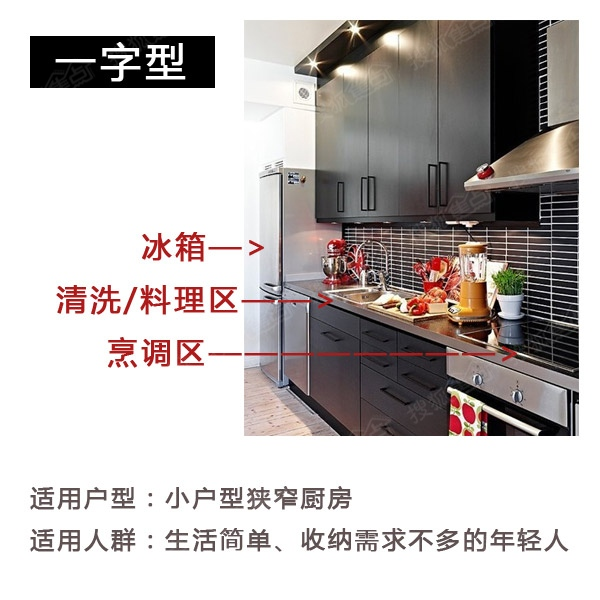 一字型厨房布局:所谓一字型厨房,指的是橱柜与操作台呈长方形,占用的空间较小,操作起来更连贯,适合狭长型厨房。以水池为中心,向两侧分别排开。仅一条动线,就可贯穿整个做饭流程。