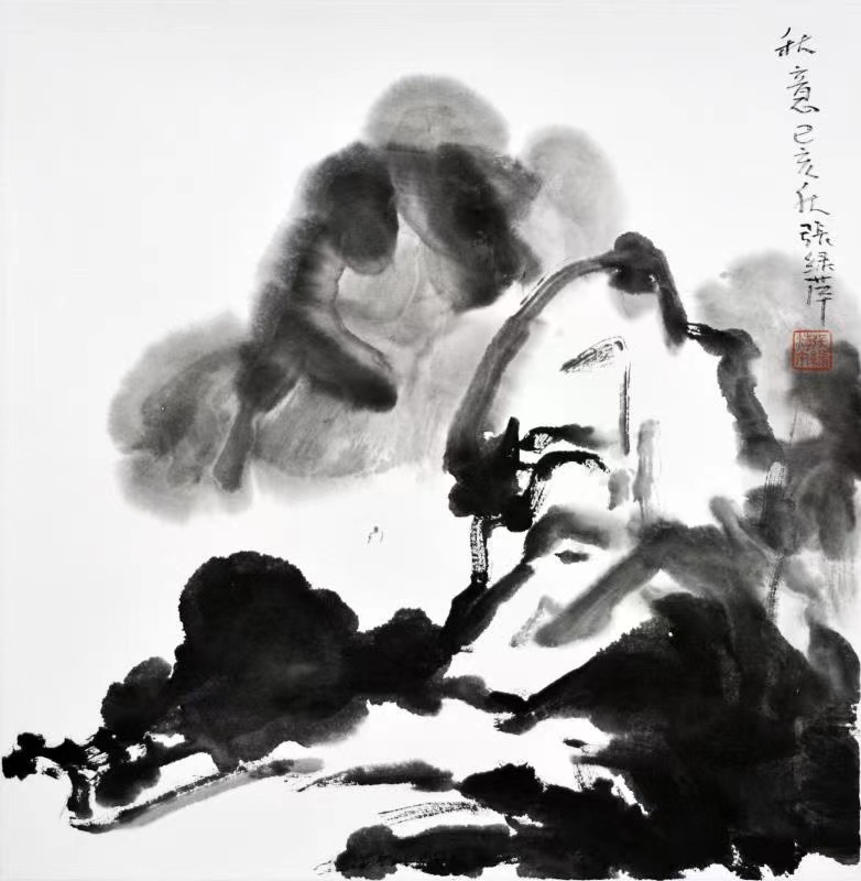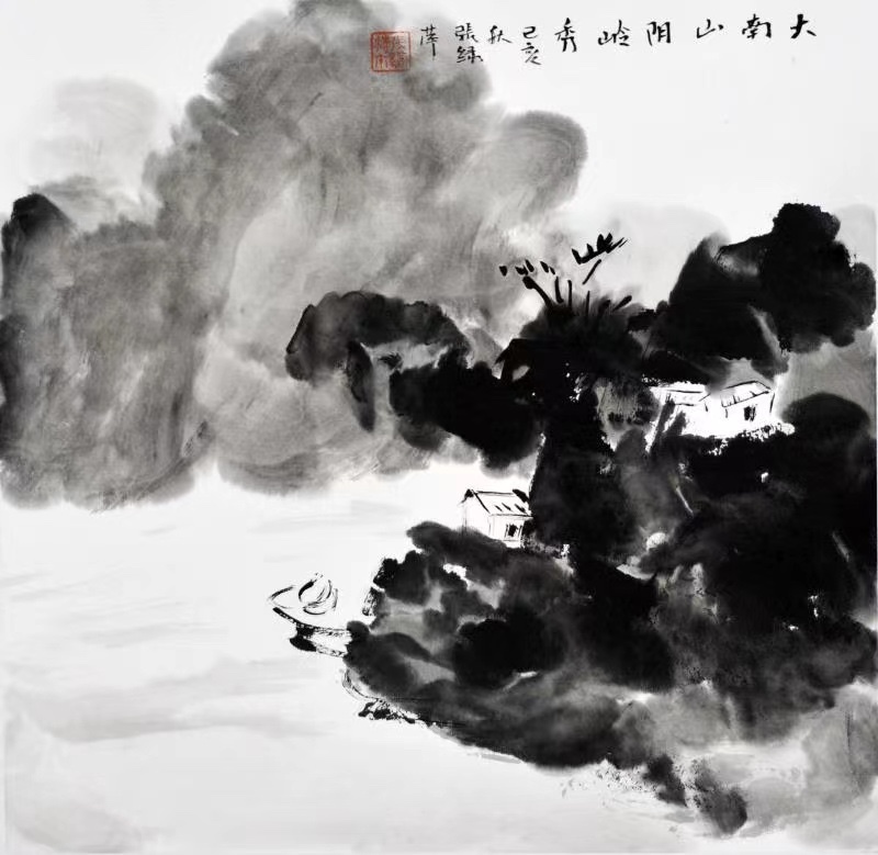 张绿萍出生在粤东普宁的中医世家,在粤东潮汕地区,传统国学文化在民间有广泛的普及基础,他自幼受家学传统文化熏陶,也热爱书画之艺,十多年前,曾转益多师于本地和海派的名家,在此阶段,已积累了丰富的严谨古法写实技巧,从其所仿作的北宗一路画作来看,他已经能够熟练掌握传统技法中以勾、皴、点、染为程式的要领,并转辗各地写生,探寻古法的传统方式与真实的自然景象之间更为有关联的表现方法,这种意识体现出他在希翼脱离古法的束缚所作出的努力与回归自我心性抒发的诉求。返穗定居后,得广东画院著名美术评论家兼画家陈迹先生点拨,画风遂为突变,从以往北宗一路的谨严画法变为简逸狂放的大写意体例。诚然,这种转变是观念意识的自觉,而摹古的功夫也正是张绿萍在观念赖以改变的最坚实基础。观其近作,大体上以文人画野逸的路子为宗,笔意取法黄宾虹、赖少其、陈子庄、罗铭等名家墨迹,用墨则以率意随性的近于泼墨的酣畅淋漓手法,画面上大多以几块大面积的墨迹构成整体的节奏关系,摒弃了重重叠叠的空间深远递进描述,近乎于汉代画像的平面装饰效果,其中又作为点睛的意趣所在,往往是一叶扁舟,一人独自往还,在画意诗情的抒发中,正体现出某种意义上的“空性”之 境。