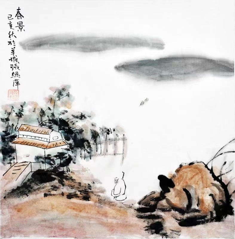 今年春早,在广州城南的小洲艺术家村里,我受朋友之约一起到访山水画家张绿萍先生的工作室。小洲村还保留着很多旧时的老房子,在石板青砖和古榕参天的景象里,颇有进入画中游的感觉,这里住了很多艺术家,他们的工作室门前是一条清澈见底的小河,水中鱼在游,天上鸟在飞,各自逍遥。那天到访张绿萍画室的有很多远地而来的朋友,还有一些出家的僧人和居士,僧俗共会,为这个简朴的艺术空间增添了不少的野逸的气息。