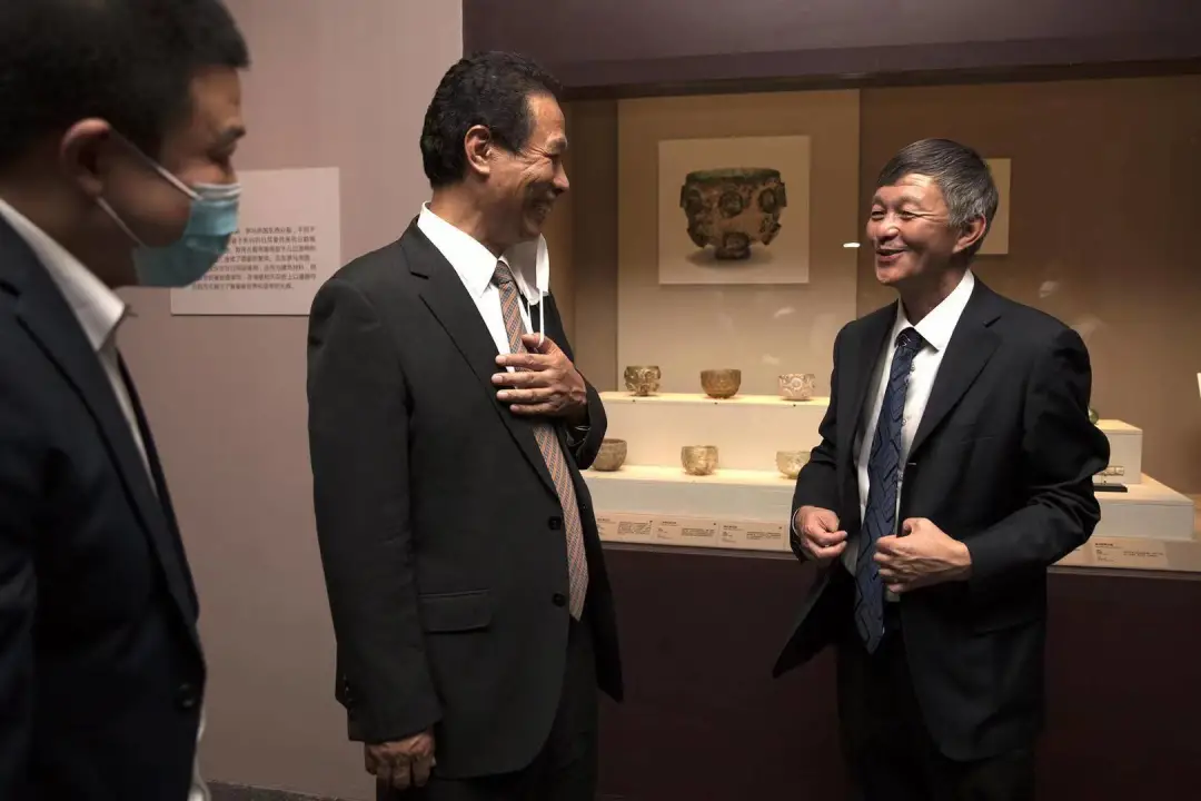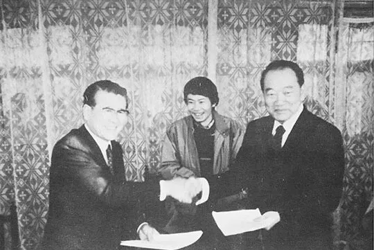 ▲ 平山郁夫(左)为敦煌研究院捐赠2亿日元