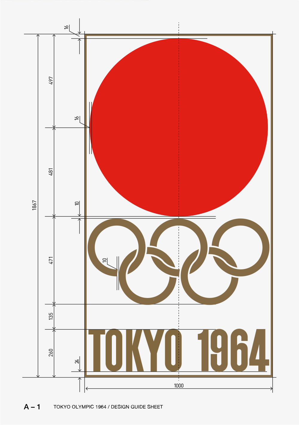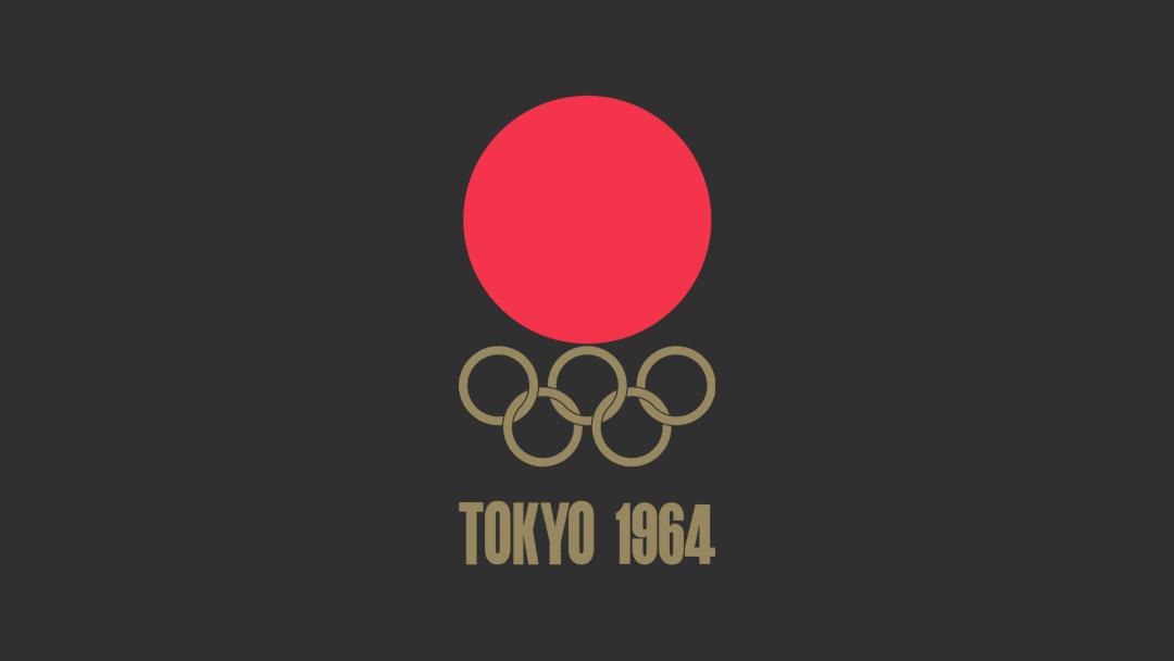 东京1964奥运会会徽由被誉为日本现代平面设计之父的龟仓雄策(Yusaku Kamekura,1915-1997)创作。一个巨大的红太阳也许象征着二战后日本的重生,它是复兴、希望和夏季奥运会理想的象征。同时它是奥运会的一个即时识别和令人难忘的标志,这是国际赛事的关键要求。