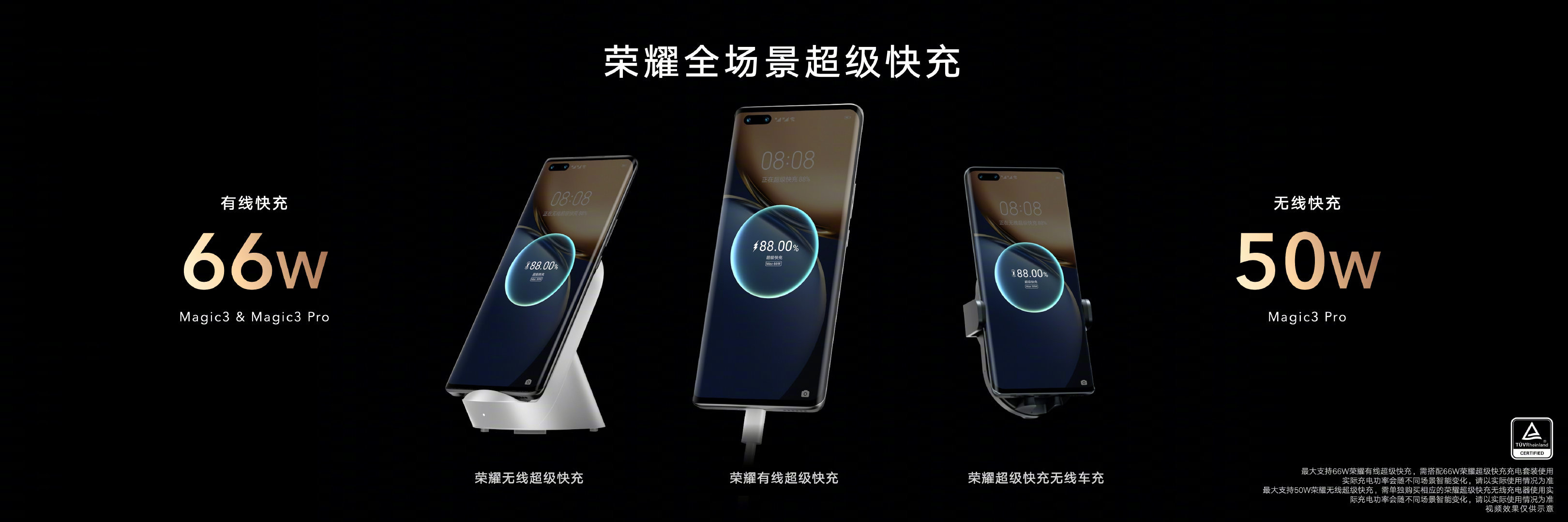 非凡性能,快亦冷静:荣耀Magic3系列配备超导六方晶石墨烯材质,导热性能比普通石墨烯提升50%,实现全方位的高效散热。快充方面,荣耀Magic3系列配备了4600mAh大电池,荣耀Magic3支持66W有线超级快充,荣耀Magic3 Pro支持66W有线和50W无线双超级快充,满足大家在不同场景的快充需求,全系列均通过了德国莱茵安全快充的认证。快充不止于快,更要又快又安全。