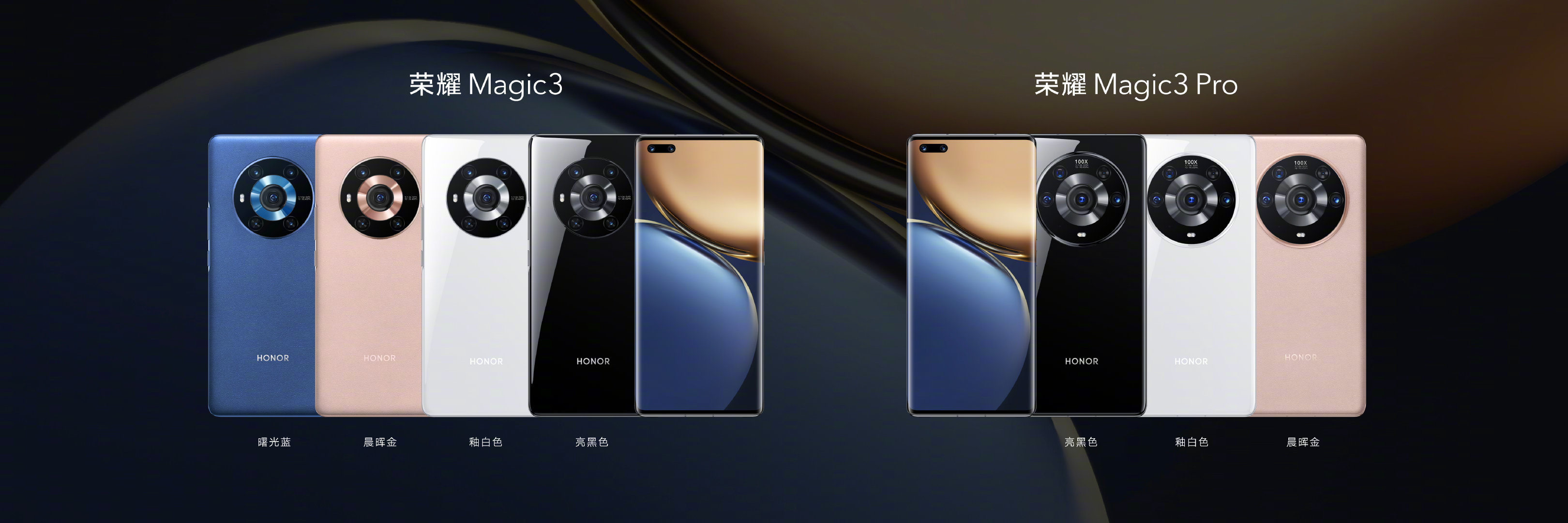 非凡设计,致敬Magic Hour:荣耀Magic3系列的色彩灵感来源于大自然魔法中的Magic Hour:“曙光蓝”代表成熟、冷静和睿智,蕴藏着韬光养晦后再次出发的实力和勇气;“晨晖金”红橙色调重现黄金时刻的温柔光线,欲为世界注入温暖和力量。 荣耀Magic3有晨晖金、曙光蓝、釉白色、亮黑色四种配色;荣耀Magic3 Pro有晨晖金、釉白色、亮黑色三种配色。非凡设计,于破晓时刻,致敬Magic Hour!