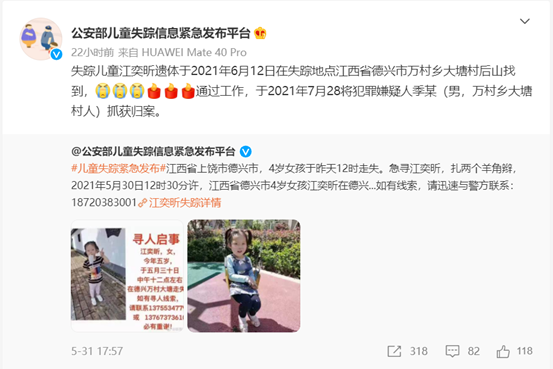 8月10日,公安部儿童失踪信息紧急发布平台官方微博发布通报称,江西失踪女童江奕昕遗体于2021年6月12日在失踪地点江西省德兴市万村乡大塘村后山找到,于2021年7月28日将犯罪嫌疑人季某(男,万村乡大塘村人)抓获归案。其实这人世间最动人的话是“我回来了”,但我们一直期待着的奇迹,终究还是落空,永远定格在5岁。