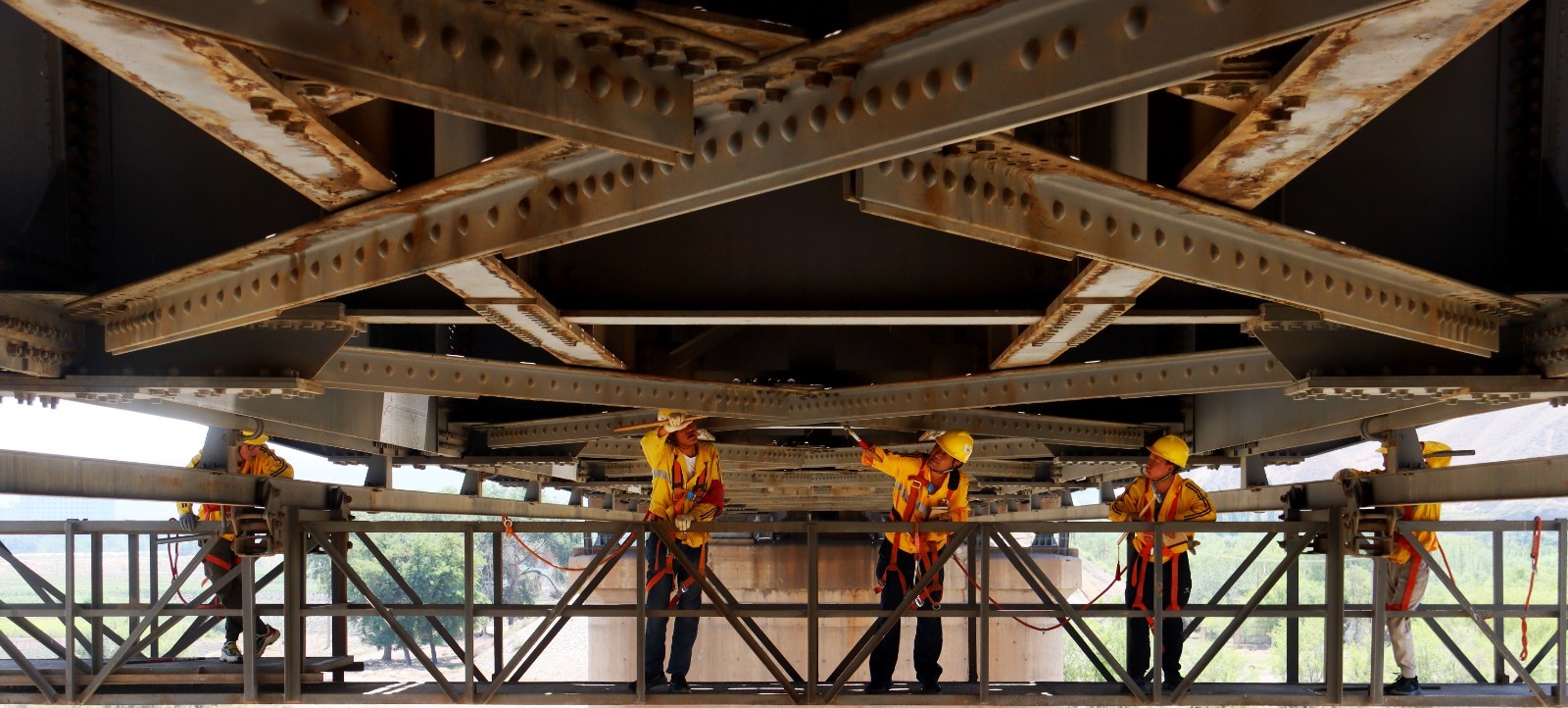 8月13日中午,炎炎烈日下,兰州西工务段白银桥隧车间桥隧工爬桥顶,钻桥底,为靖远铁路黄河大桥“把脉问诊”,确保暑期、汛期铁路运行安全。 靖远黄河大桥,位于甘肃省白银市靖远县乌兰镇西北5公里,白银至长征铁路支线和包兰公路上跨越黄河干流的平列式、公路两用桥,是甘肃境内的第一座公铁两用桥。为栓焊连续工字桁梁,下部为钢筋混凝土结构,以铁路桥为轴心,两侧公路桥并行于钢桁梁托架上,单行道与人行道宽4.7米,全桥共6墩2台,净跨60米,净高9米,长350.28米。掌上兰州·兰州晨报通讯员 宋佳龙 王光辉 记者 裴强 摄影报道