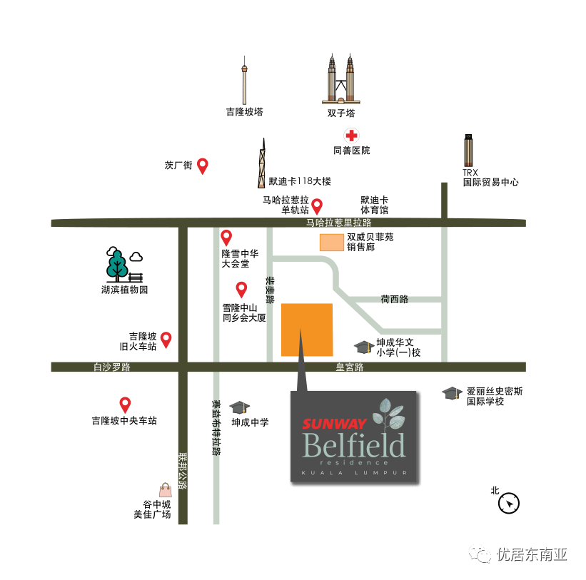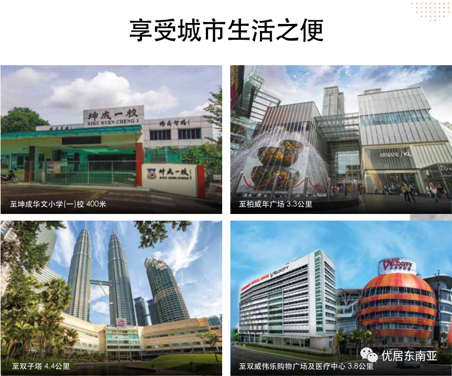 闹中取静的选址也让生活所需近在咫尺,包括马来西亚顶尖华文学校——坤成小学和中学、多所国际学校;同善医院、双威医疗中心;以及首都金三角地区都在方圆5公里内。