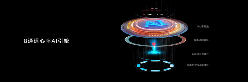 心率 AI 融合技术,8 通道数据采集,4 通道数据处理,AI 算法融合,能够更快、更准确捕捉用户的心率信号。频率追踪算法和 AI 心率算法双算法融合,双引擎同时计算,定位心率更精准。