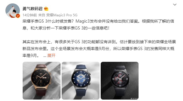据数码博主 @勇气数码君 今日最新爆料,荣耀将于今年 9 月举办荣耀全场景新品发布会,并在此发布会上正式推出荣耀手表 GS 3。