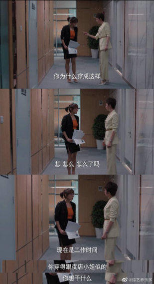 剧中有个桥段,是一个女生,吴红玫,在单位里经常被自己的领导“针对”,比如,明明穿的很好看,开开心心到公司上班,结果被嘴毒的上司说“穿的跟夜店小姐一样,想干什么?”