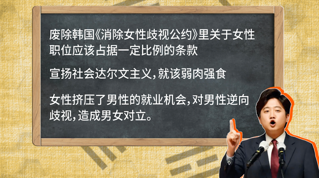 他向韩国年轻男性定向投喂了一大批反女权的主张,比如废除韩国《消除女性歧视公约》里关于女性职位应该占据一定比例的条款,宣扬社会达尔文主义,就该弱肉强食,宣称女性挤压了男性的就业机会,对男性逆向歧视,造成男女对立。