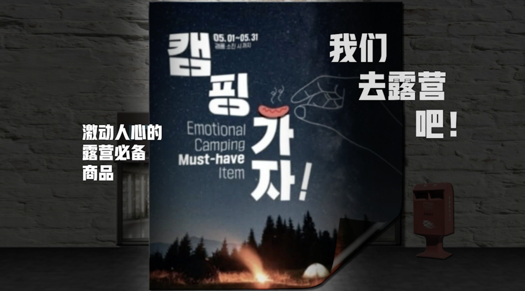 海报上方写着:“我们去露营吧!——激动人心的露营必备商品”。