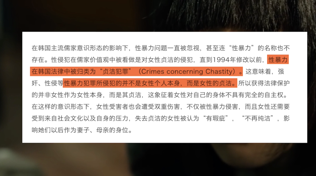 还有女性的人身权利问题。韩国法律一直不把强奸视为伤害女性的身体,而是啥呢?是伤害了贞洁,也就是配偶的初次占有权。这种出土文物级的法律条文,1994年才废除。