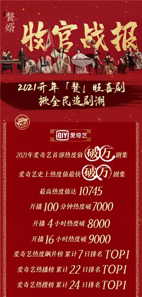 作为今年首个现象级爆款剧集,《赘婿》弹幕总量超1600万,全网热搜话题超900个,“吉吉国王”“贵客光临”“苏宁毅购”等热梗更是破壁出圈。