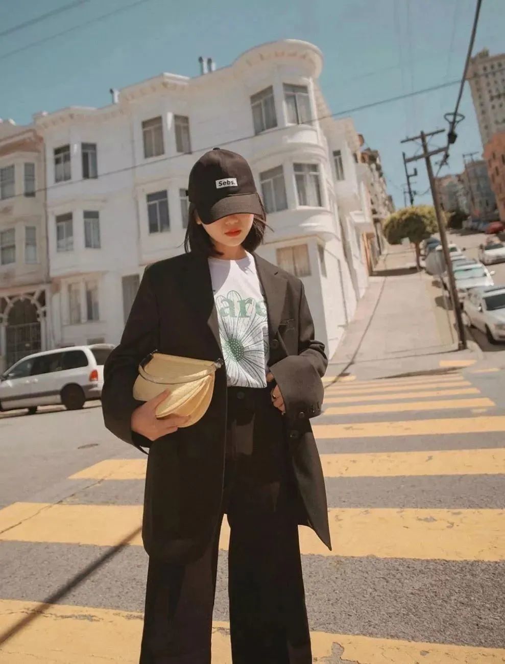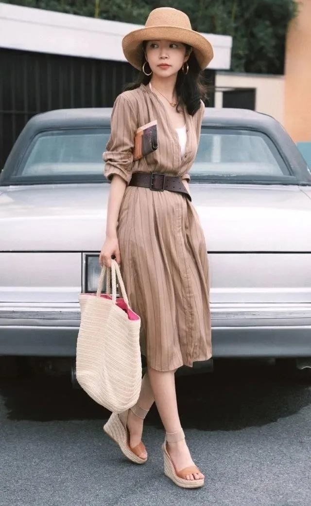 上下装的腰线不够突出的时候也不用担心,借用腰带的力量也可以打造高挑腰线的效果。一条腰带加身,直接将比例打造成了上短下长的效果,腰在腰带的作用下显得非常纤细,而下半身也因腰带制造的分界线,变得极其修长。
