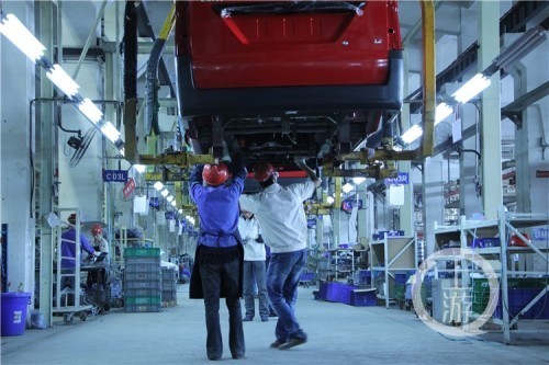 万州经开区天子园的车辆生产车间,整装线上平均每2分半钟就有一台车下线。要是几条整装线马力全开,一天可下线七八百辆轻卡载货车。