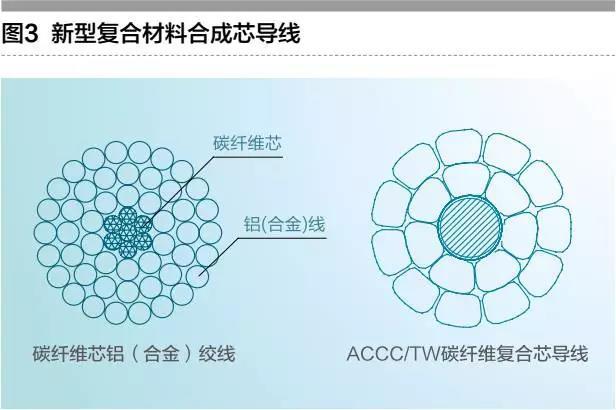 美国CTC(CompositeTechonologyComporation)公司成功开发了新型复合材料合成芯导线。其系列ACCC(复合芯铝绞线)导线芯是由碳纤维为中心层,和玻璃纤维包覆制成的单根芯棒,将碳纤维与玻璃纤维进行预拉伸后,环氧树脂浸渍,然后在高温模子中固化成型。芯线外层与邻外层为梯形截面铝线股。导线经常规型试验,证明其具有良好的机械特性和电气特性。