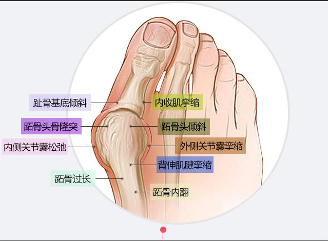 5、轻度拇外翻可在第1、2趾间夹棉垫,夜间在拇趾内侧缚一直夹板,使拇趾逐渐变直。