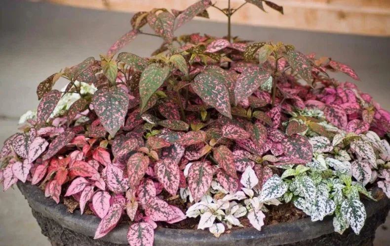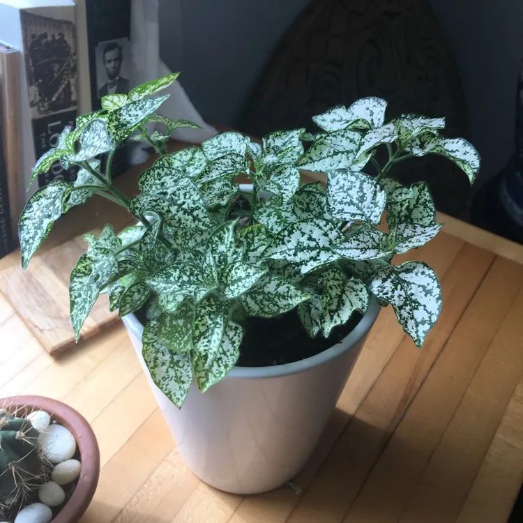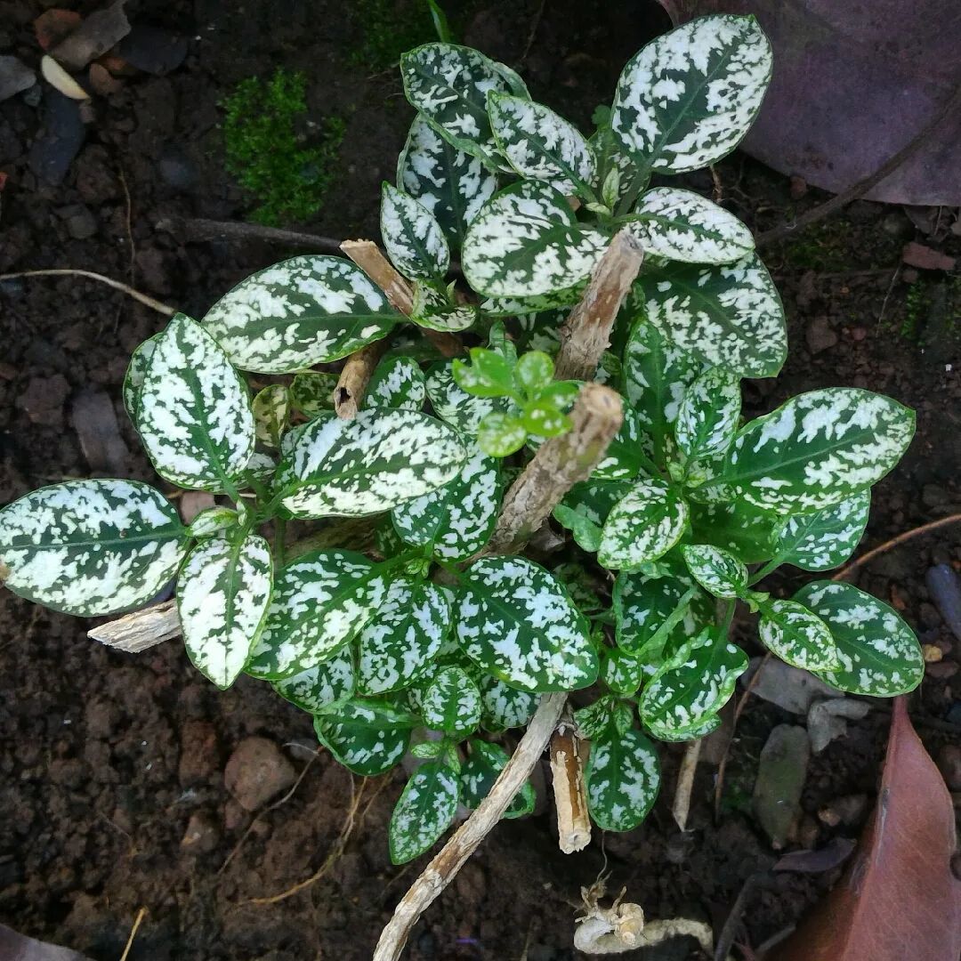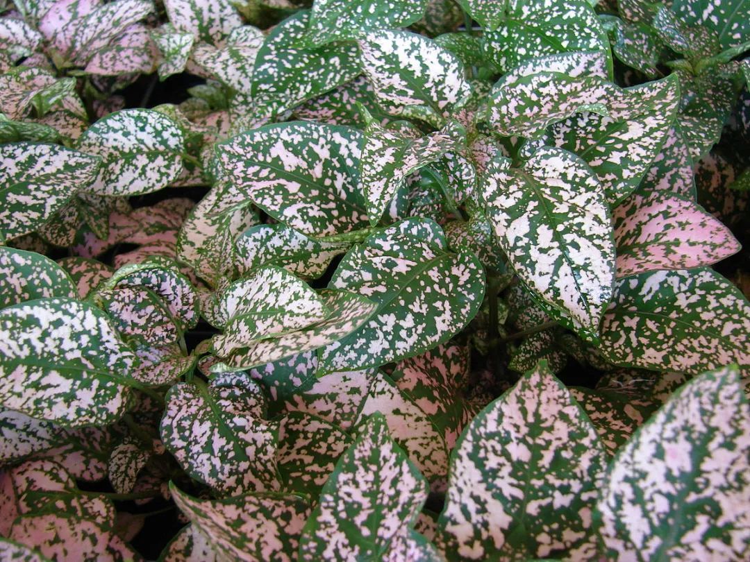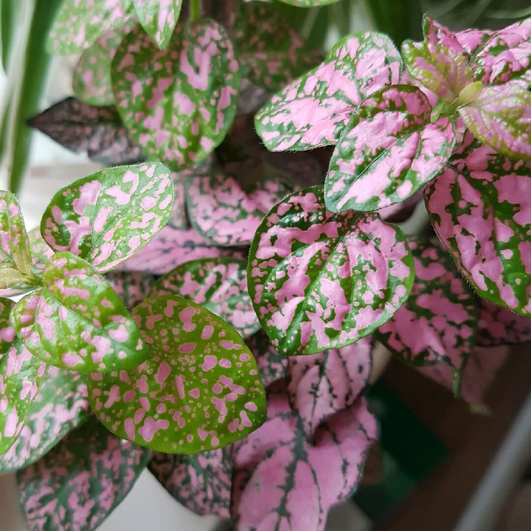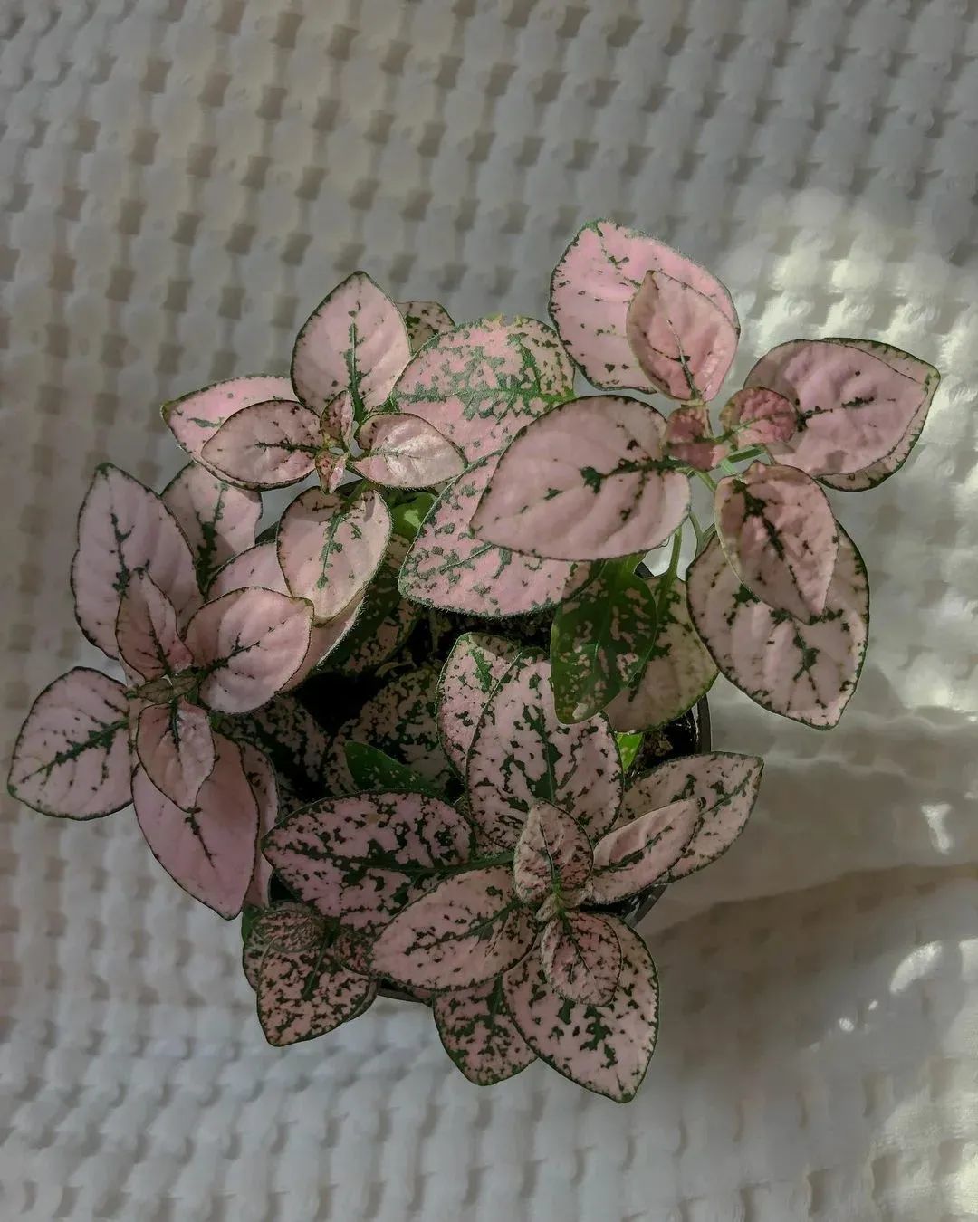 嫣红蔓的植株矮小,一般就长到15~30厘米高,是一种特别低矮的小植物,它的叶子上会有很多粉色白色的斑点,就像喷上油漆一般。
