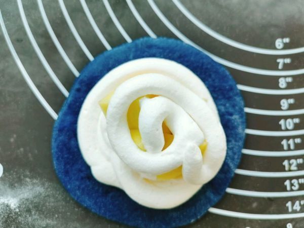 10.拿一个皮,把里面挤上一圈奶油,上面放上爱吃的馅,然后上面再挤上奶油。我图片做的是芒果的,还做了奥利奥碎的。