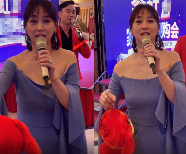 翁虹手里拎着一个红色的公仔,拿着话筒下台和大家互动,非常平易近人。引人注意的是,由于翁虹的领口松垮,手臂摆动幅度大,肩膀处衣服滑落,露出香肩险些走光,好在她及时调整好了自己的姿势和状态。