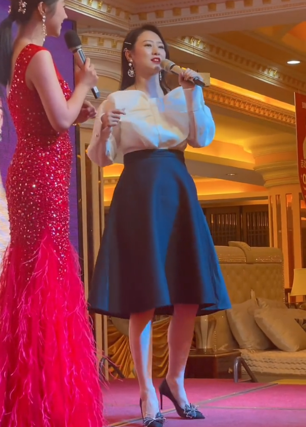 当天,翁虹穿着一件紧身包臀连衣裙,一字领的设计显得身材丰腴女人味十足,肩膀略显厚实,腹部的小肚腩微微凸起。不过这对于一个年过半百的人来说也是正常的,翁虹整体看起来身材还是保养得不错的。