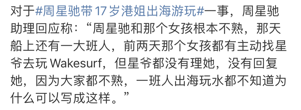 他表示,周星驰与张晓祺根本不熟,张晓祺多次主动找周星驰出海冲浪,但周星驰都没有理会,而且那天船上还有好多人,这些都是女方炒作罢了。
