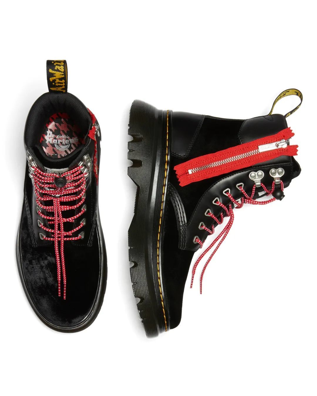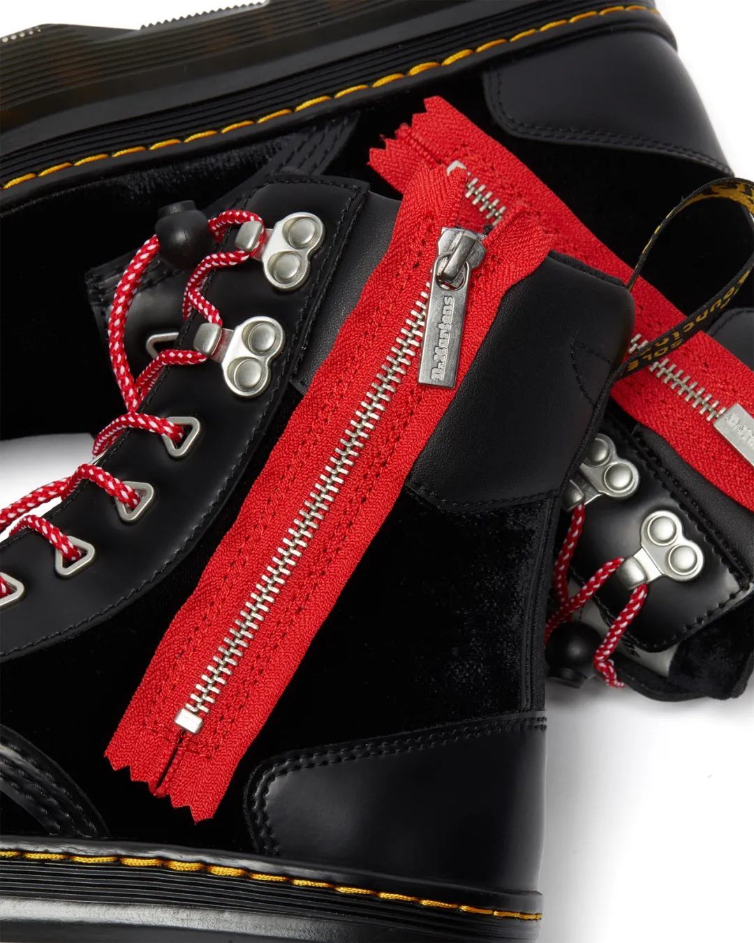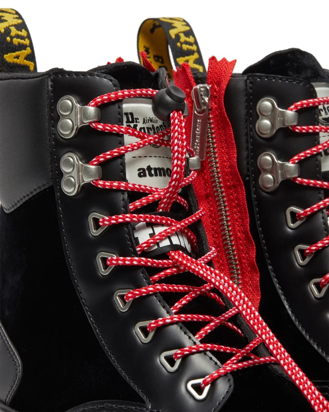 本次合作靴款采用了光面Smooth皮革和天鹅绒拼贴的鞋面设计,并佐以PU衬垫,融合了街头风格和实用主义。鞋舌则由饰有双品牌logo的透明TPU泡沫材料制成,拢在极具atmos品牌风格的鞋带内;拉丝银色孔眼与卡扣由红白拼色织带及索套收束着,与双品牌基因的黑红拼色千鸟格鞋床相得益彰。这些设计元素搭配于烟黑色Tarian外底之上,并以夸张的外置拉链设计和标志性的黄色边缝线收尾。