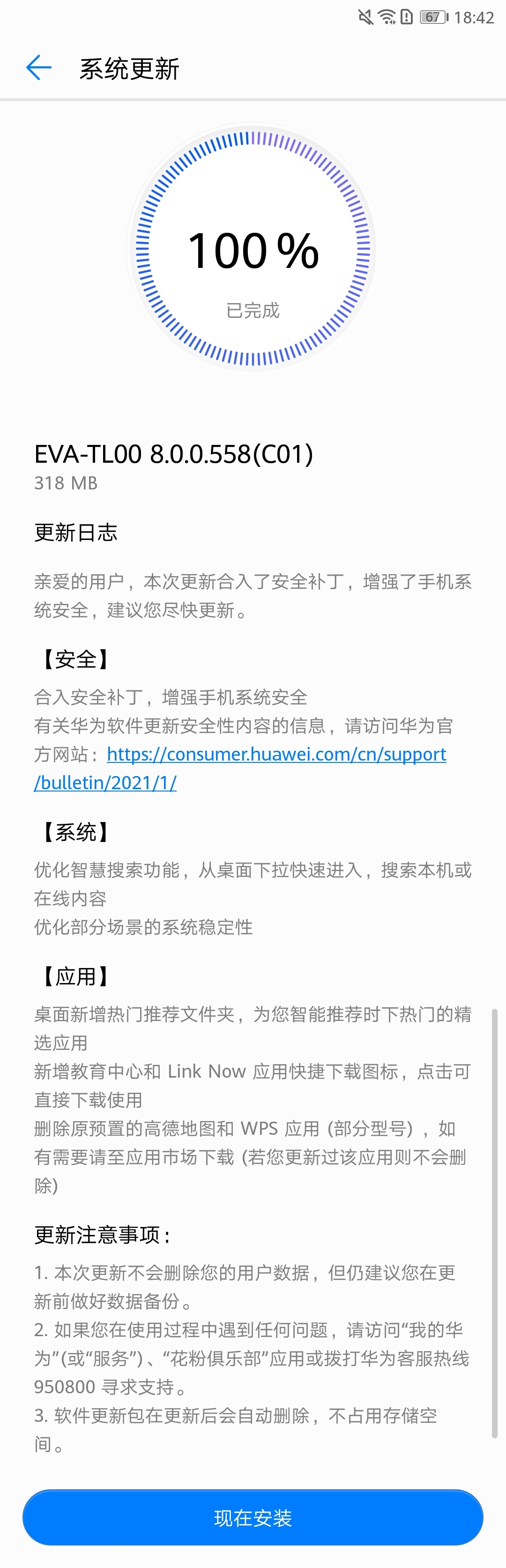 8 月 17 日消息 据网友反馈,华为 P9 手机近期迎来了 EMUI 8.0 系统 EVA-TL0O 8.0.0.558 (C01),大小 318 MB,官方日志显示,本次更新合入了安全补丁,增强了手机系统安全,建议你尽快更新。