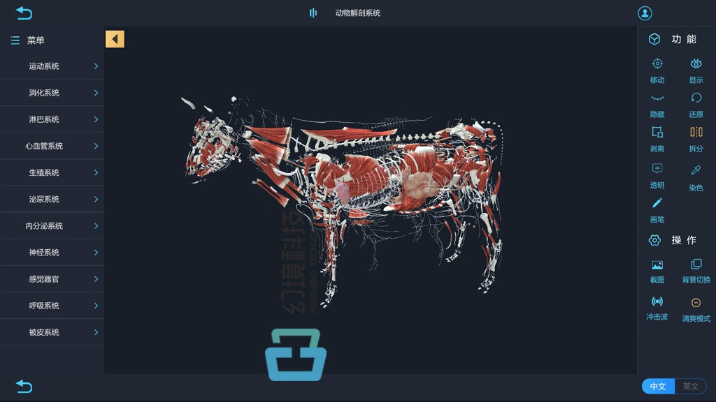 通过动物解剖虚拟仿真教学软件,用户可以“真实”地接触到动物的内部构造,可以看得到动物的3D标本及3D模型,其中的肌肉、骨骼、器官等组织都是可以移动及单独显示的。而且支持病理解剖、比较解剖、断层解剖等多种解剖形式。生动的画面和交互式体验,是学生学习动物解剖的好帮手。