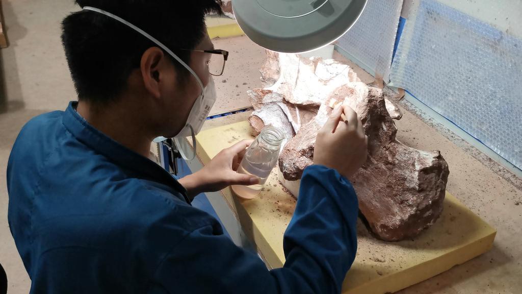 “修复工作要非常细心静心,有时一节椎体就要花上一个月的时间。”刘安浩一边和记者讲述自己的心得,一边给化石露出的部分涂上保护试剂。有时化石开裂了,还要在裂缝里注入黏合剂进行加固。