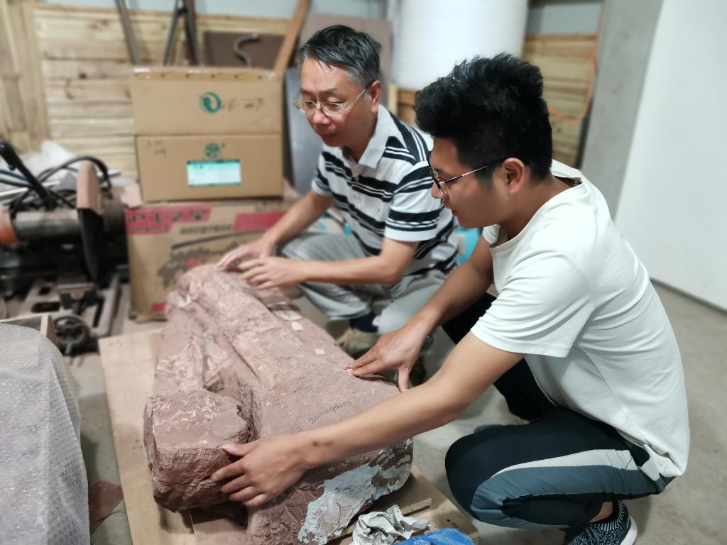 (金幸生(左)和刘安浩正在商量修复化石的思路。新华社记者 冯源 摄)