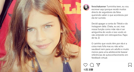 近年, 随着因社交媒体诱发的意外事件频生,社会对社交媒体负面影响的关注和讨论也越来越多。巴西网络红人Nina Rios(Valentina Rocha Kanner Rio)年仅14岁,但因出众的外型,在TikTok 和Instagram 帐户积累约170万粉丝。日前,她的社交帐户无故消失,她的母亲Fernanda Rocha Kanner 其后在自己社交媒体公开是她自己做出了一个极端的举动,她认为TikTok(海外版抖音)和Instagram“不健康”,并删除了女儿的社交网站账号。