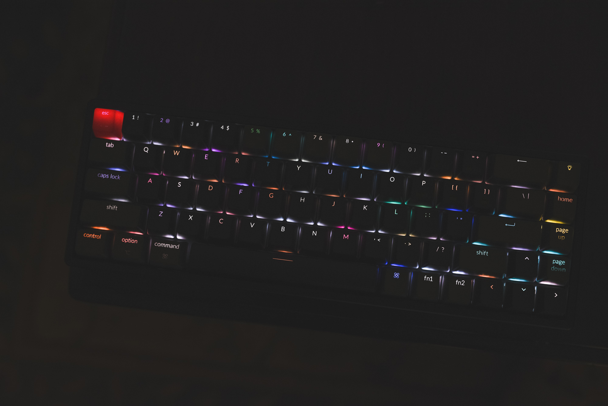 这里给大家看看,在黑暗环境下K6那低调不猖狂的RGB灯效。效果上,键帽字体亮度不如键间的效果,拍出来还挺好看的,摆脱了夜店风,有点清新脱俗的感觉。一般来说我用RGB键盘喜欢单色切换循环,K6这种零星的感觉搭配上17种光效,我觉得Keychron还是可以冲RGB的,白光太素了。