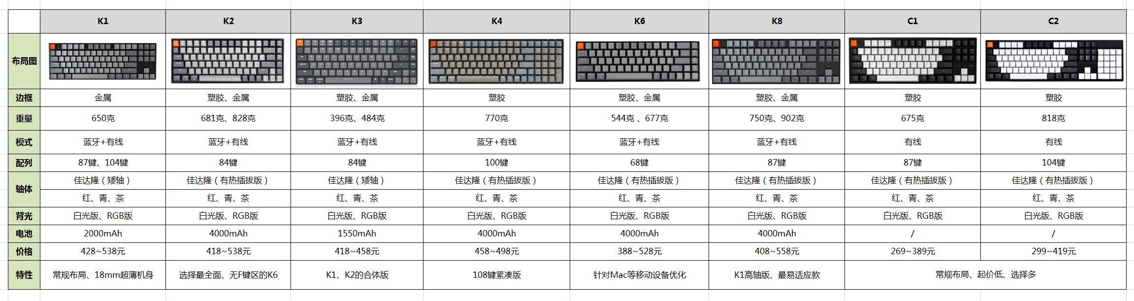 从上表中可以轻易看出,Keychron型号虽多,实际上价格跨度并不大。没有特别低的无光版、也没有跨越全系ABS键帽、PBT键帽则给了独立的购买选择、除矮轴均有插拔轴体可选,这些成为了其价不高选择广的性价比品牌调性。