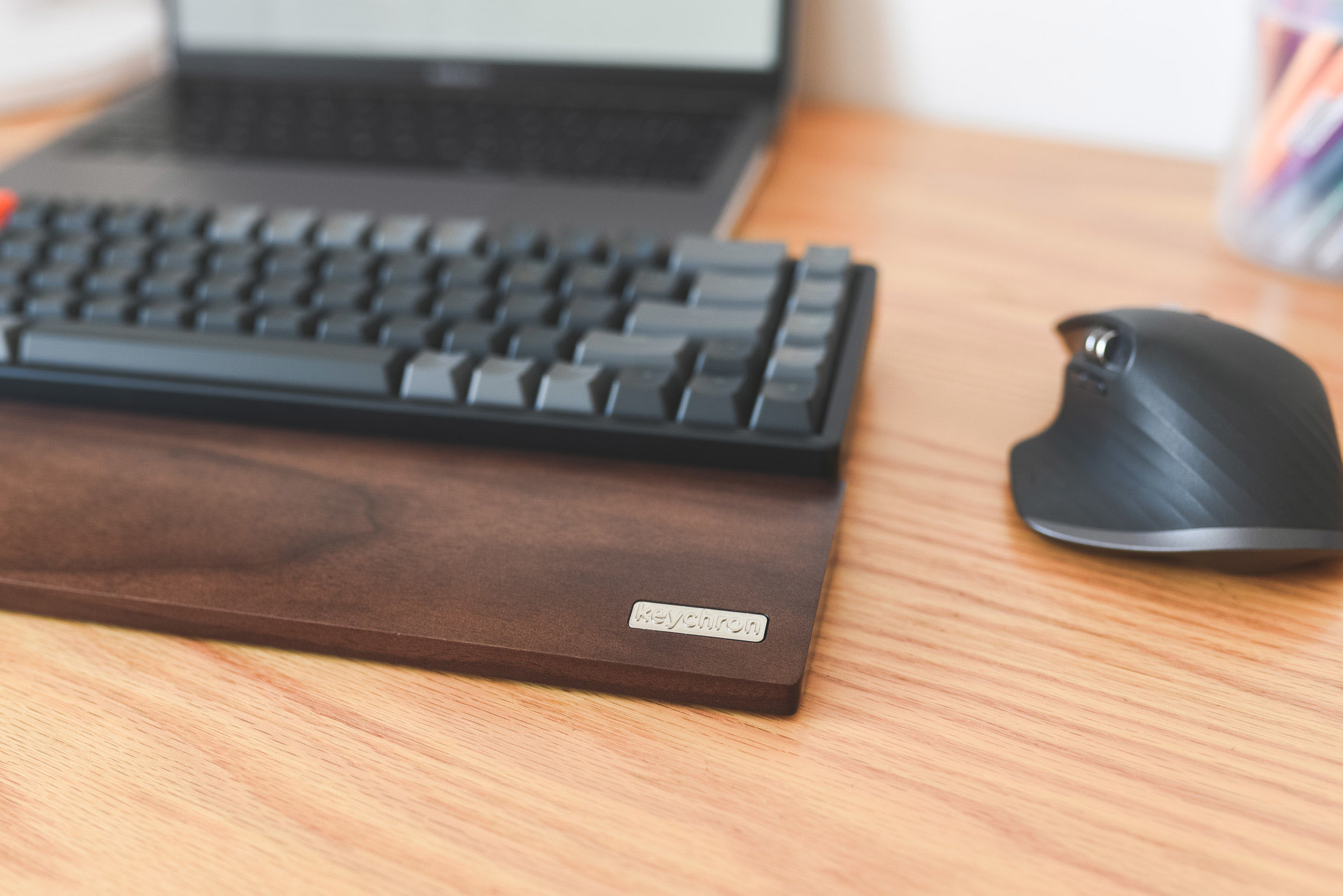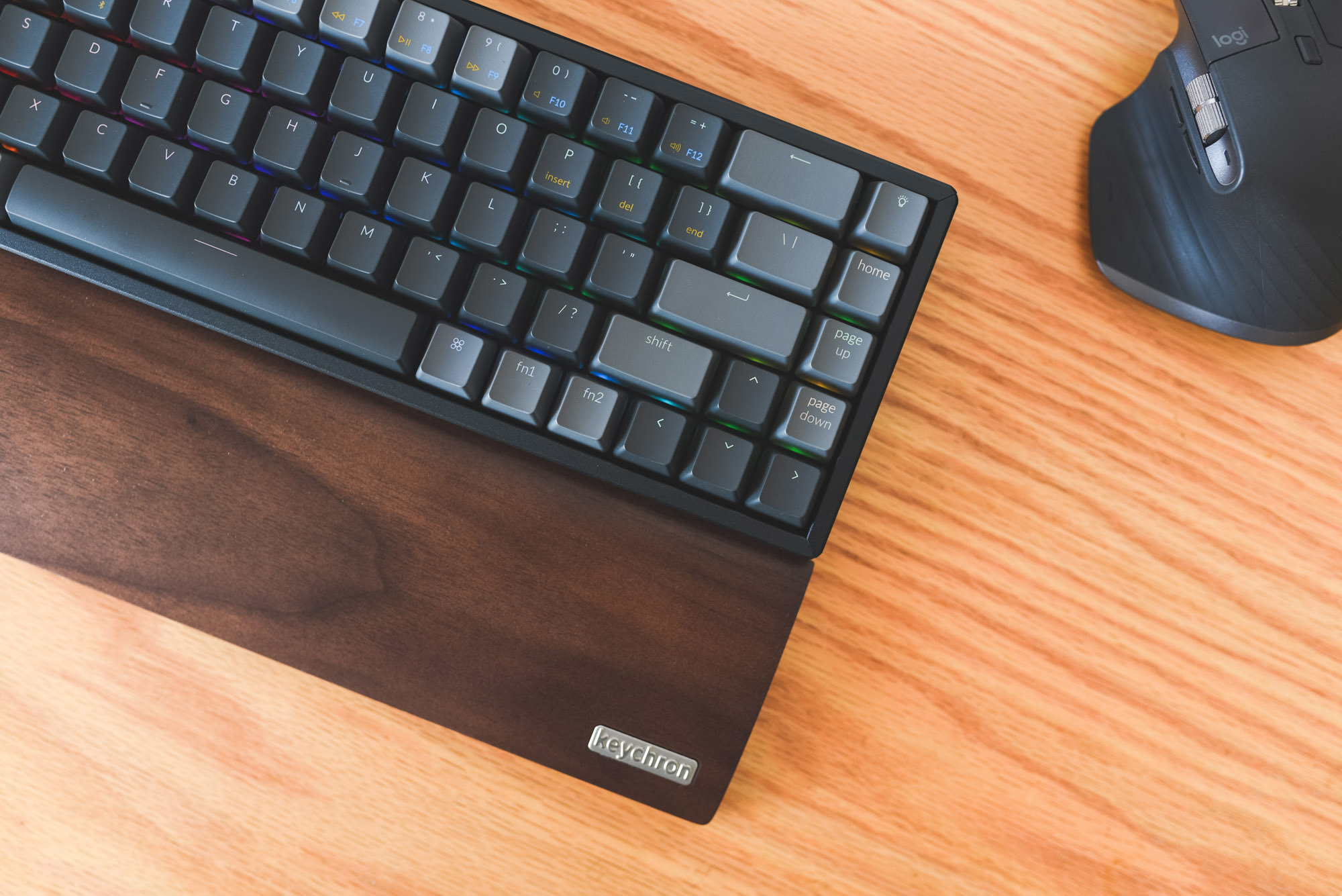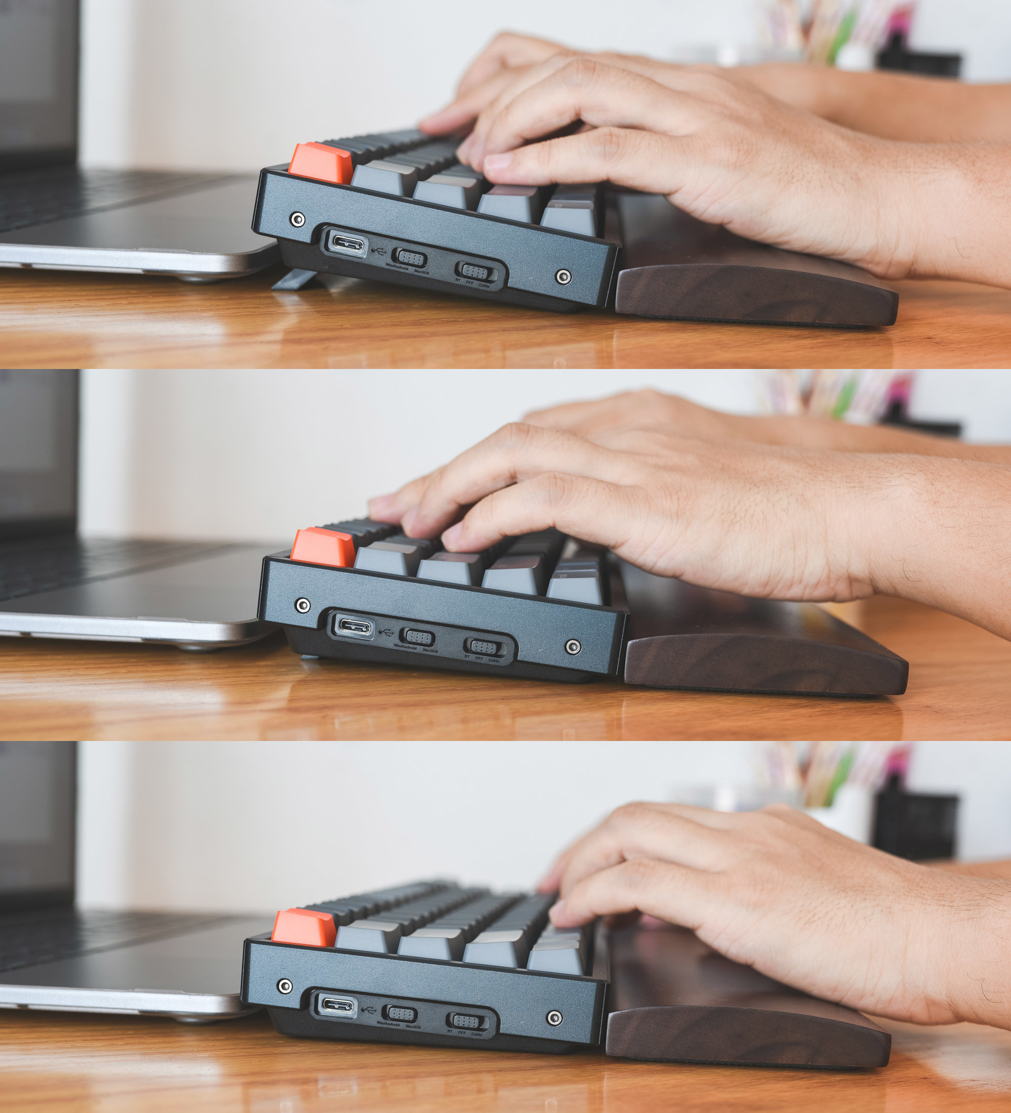 鉴于还是适合常规按键高度,所以实木手托搭配K6看起来有点低。我自己用了三周下来已经非常习惯,长期打字的舒适感肯定是有了,应该得益于常规键帽面积和更紧凑的键区。