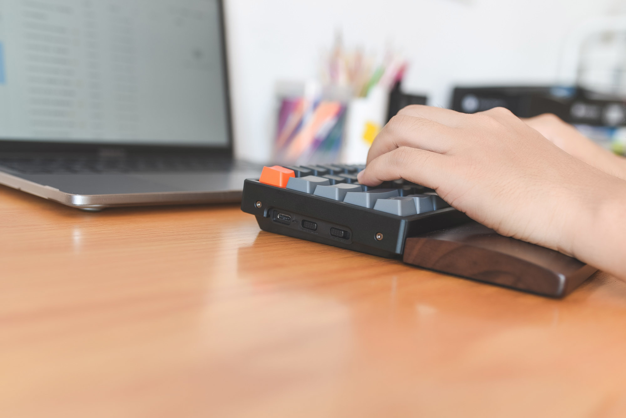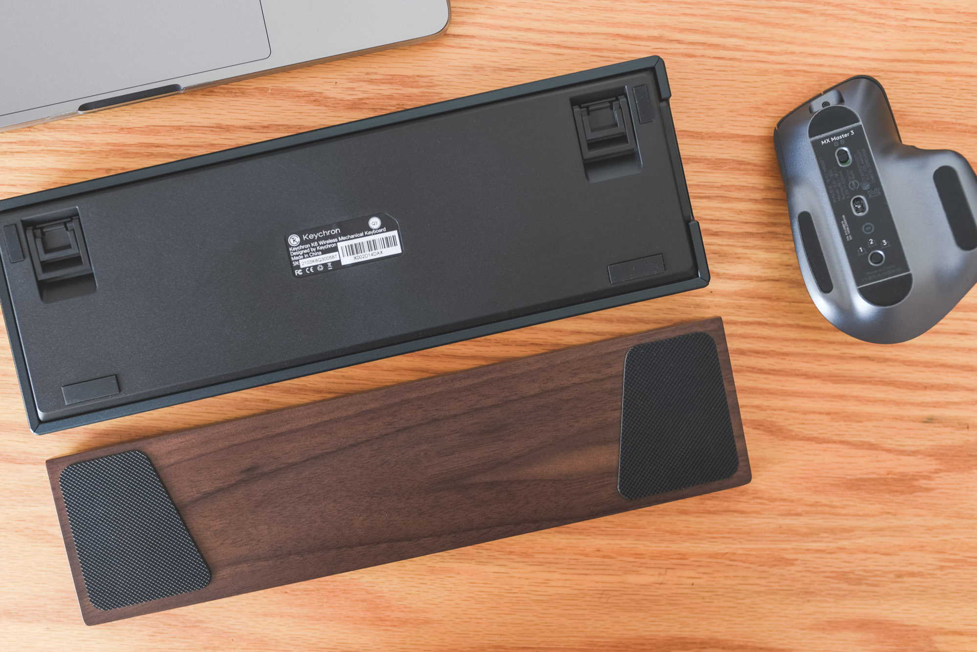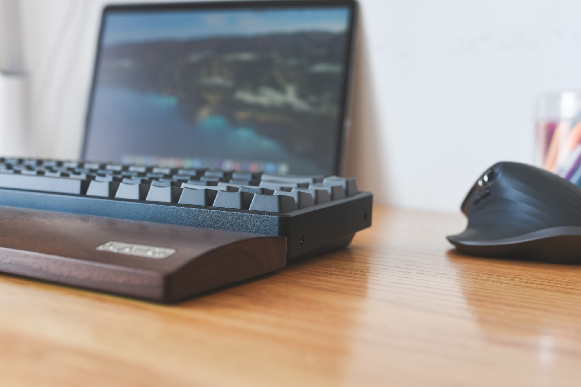 鉴于还是适合常规按键高度,所以实木手托搭配K6看起来有点低。我自己用了三周下来已经非常习惯,长期打字的舒适感肯定是有了,应该得益于常规键帽面积和更紧凑的键区。