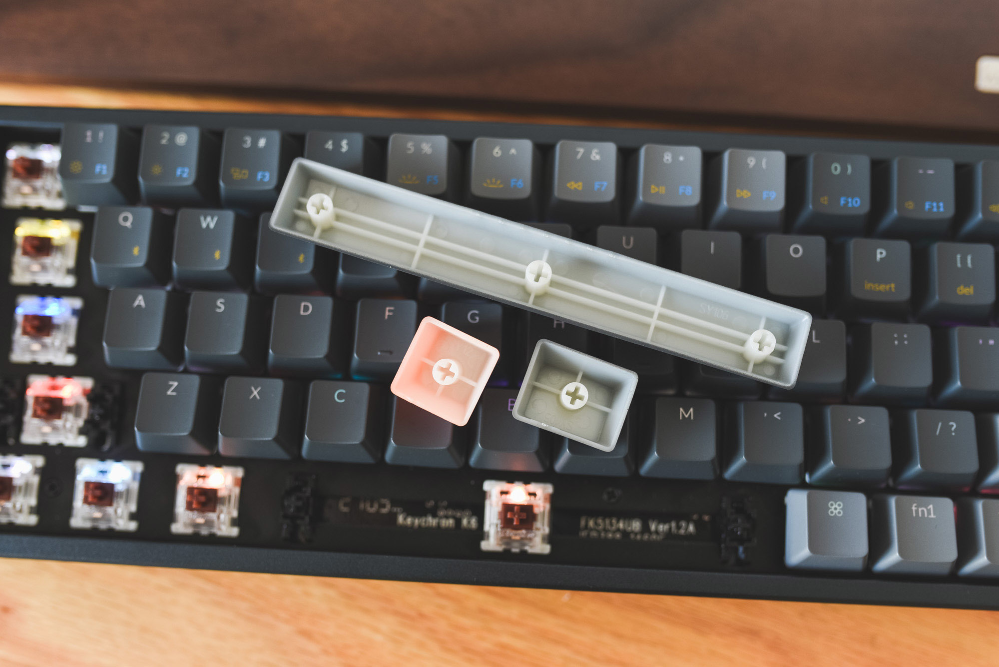 Keychron全系采用佳达隆轴体,其现在做得挺不错的,也是不少高性价比机械键盘的首选。K6在日常使用,连接键帽时基本也没有什么松动、晃动的公差问题。我手上这台K6大键卫星轴挺牢固,不知道其他人的怎么样。我有看到有更换调整卫星轴的视频,如果对于自己大键不满的建议自己动动手,有时候一小个动作可以带来很大的按键提升。