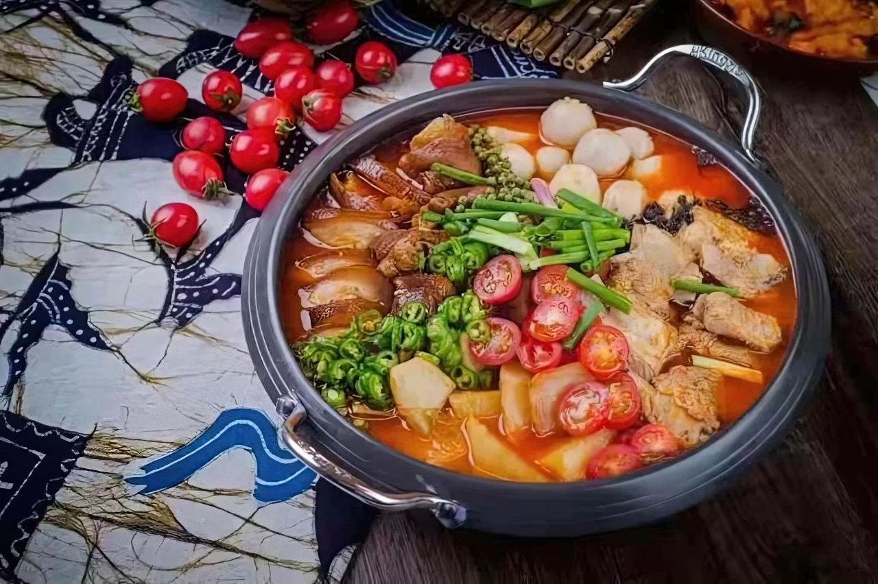 贵州人迷恋酸汤,还与贵州的地理环境有关。贵州阴冷天气多,吃酸汤锅,不仅促进食欲,还御寒暖身。旧时贵州民居,一家只有一个堂火,一家人围炉而坐,锅里酸汤翻滚,肉呀菜呀什么的往酸汤里扔,方便又快捷,而锅下温暖的炉火,更是带给一家人无与伦比的安逸。有了酸,也就不需要用盐,这很符合现代健康饮食要求,世卫组织建议每人每天盐的摄入量应控制在十克以内,中国人平均在十五克,喜欢吃酸的贵州、山西,盐的摄入量就比其他地方低。