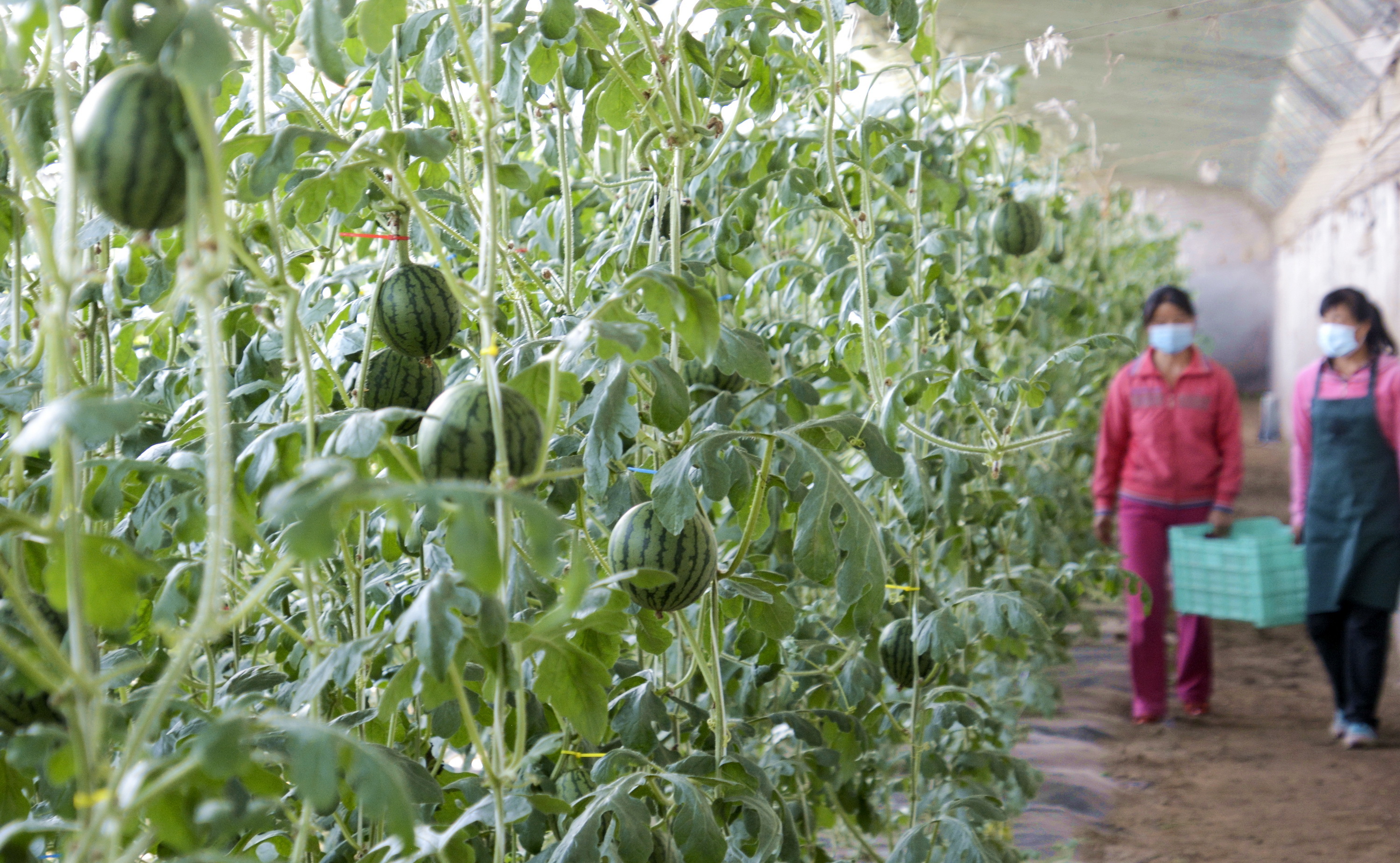 庞各庄老宋瓜果专业合作社的员工准备采摘西瓜。新华社记者 李欣 摄