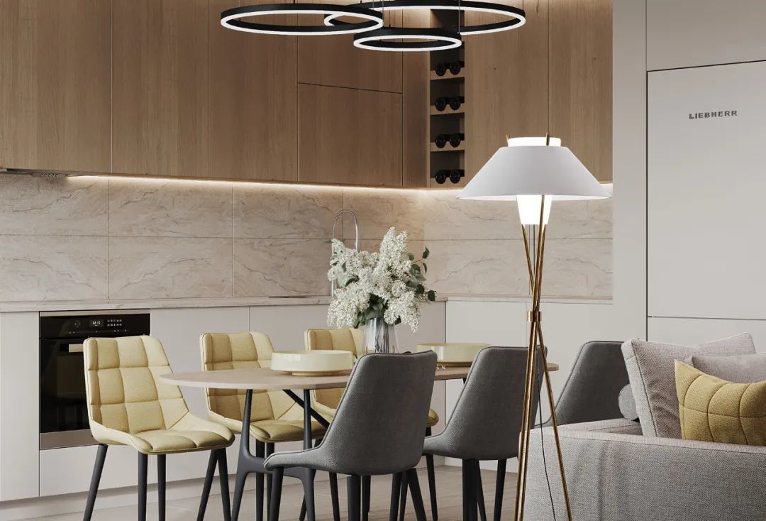 以木为底的橱柜,奠定了舒缓柔和的基调,原木与高级灰组成的橱柜,互相彰显也各自纯粹,交汇出温和、明净的生活姿态。
