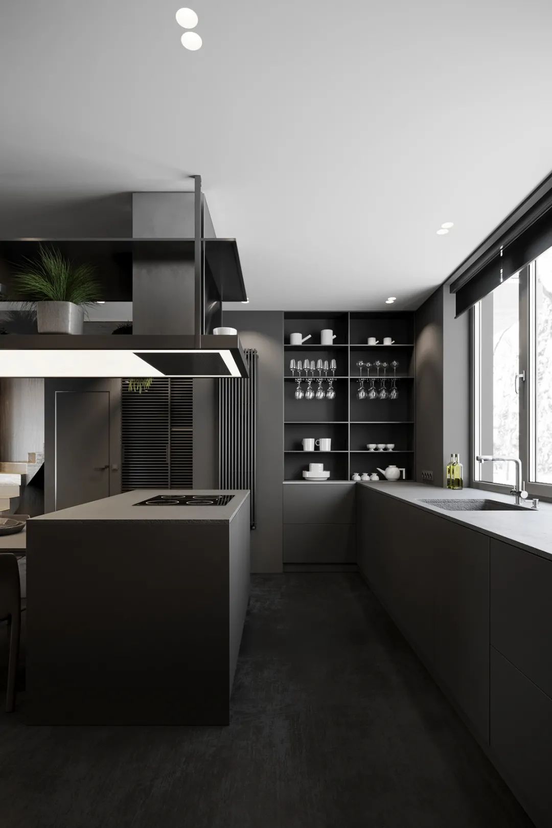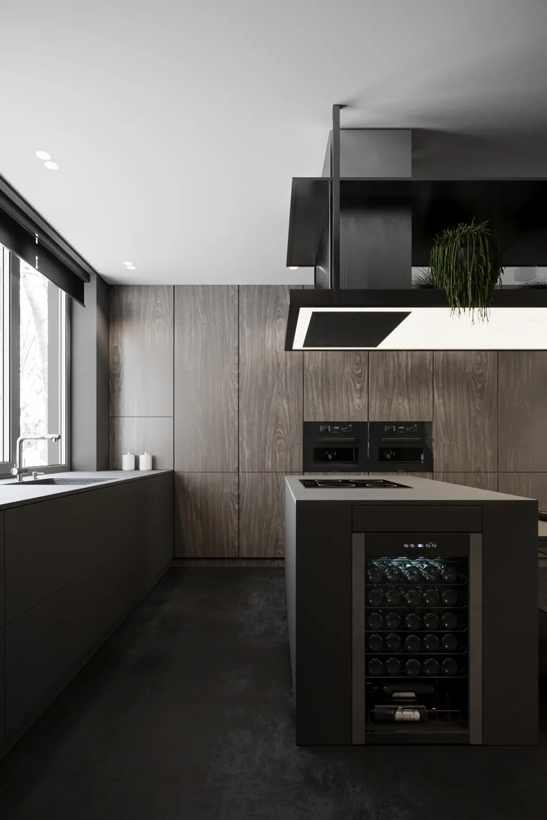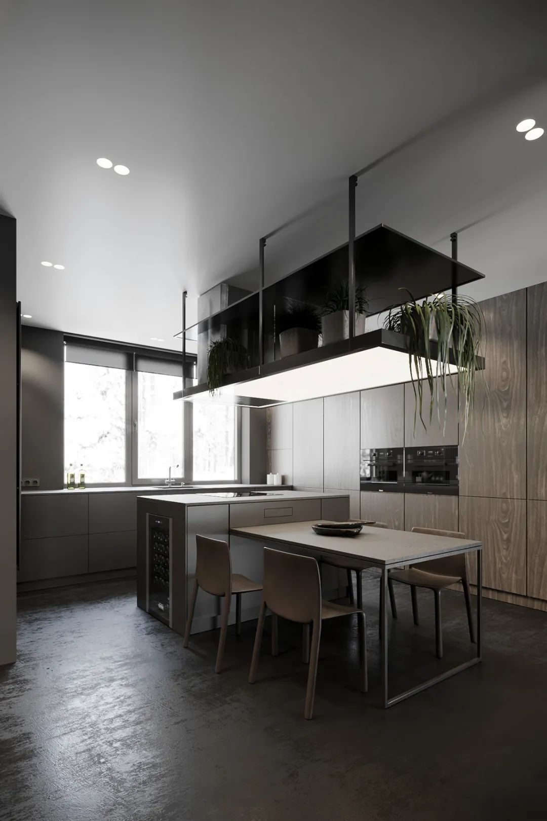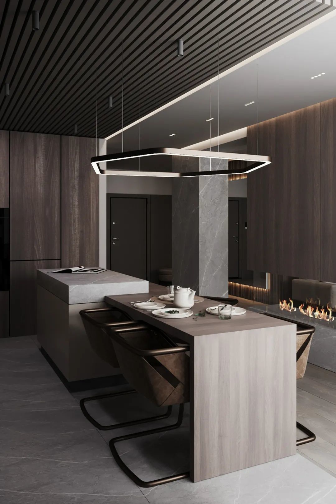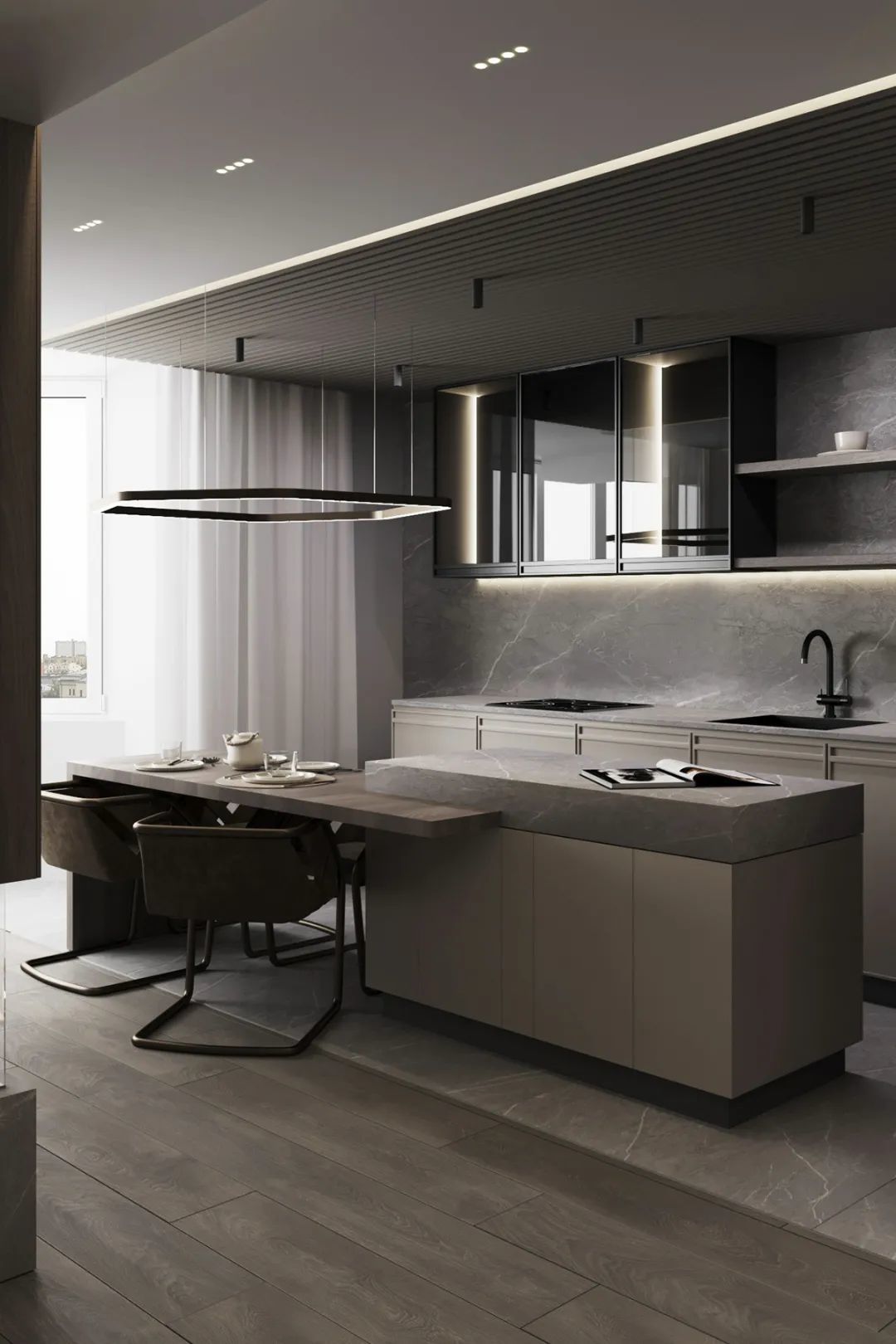 静谧优雅的厨房空间,绅士灰调主导,操作台至岛台,细腻亲肤的触感,自带高级的亲和力,另一侧整面墙的木饰面呈现,简致又彰显大气。