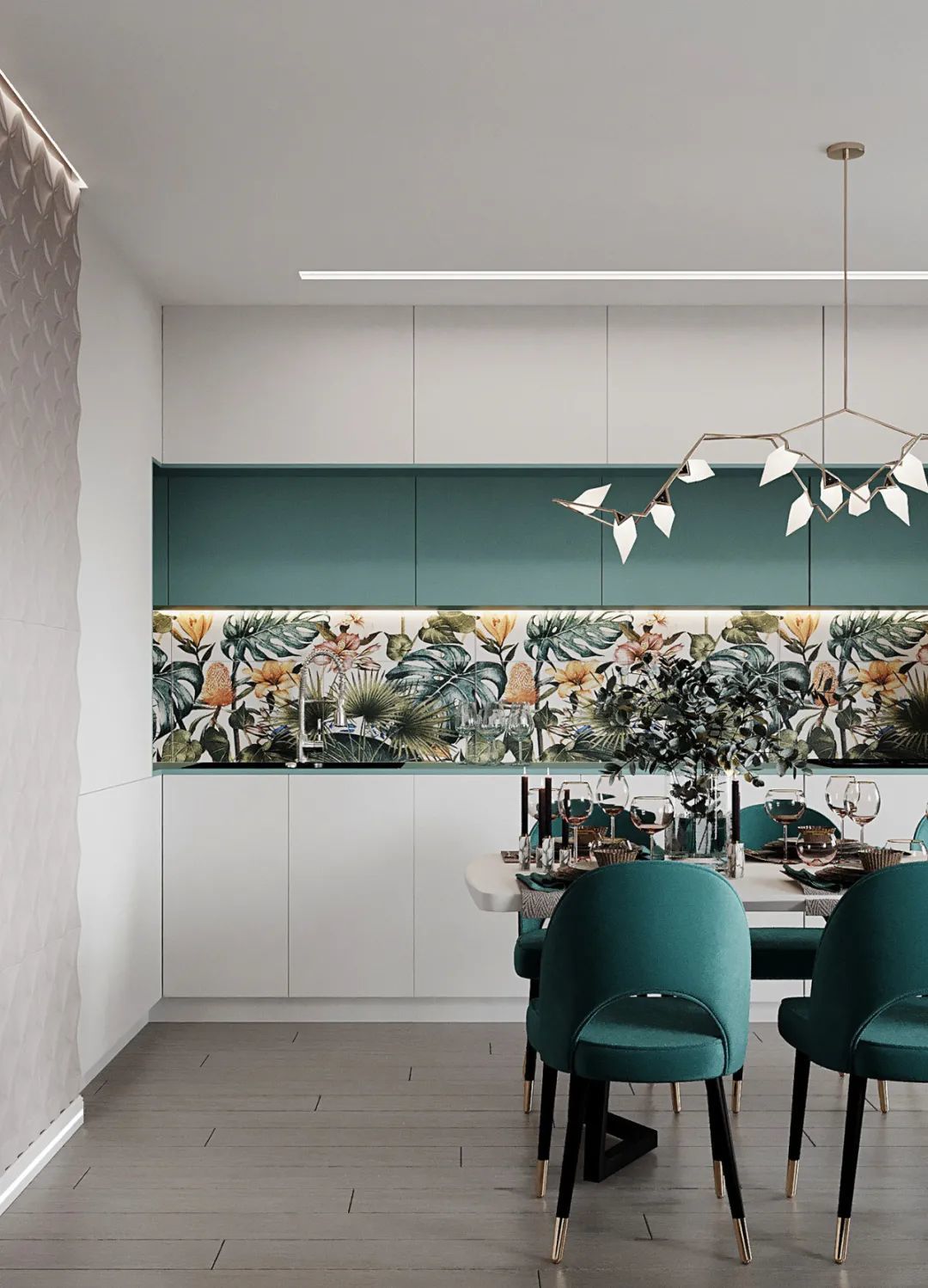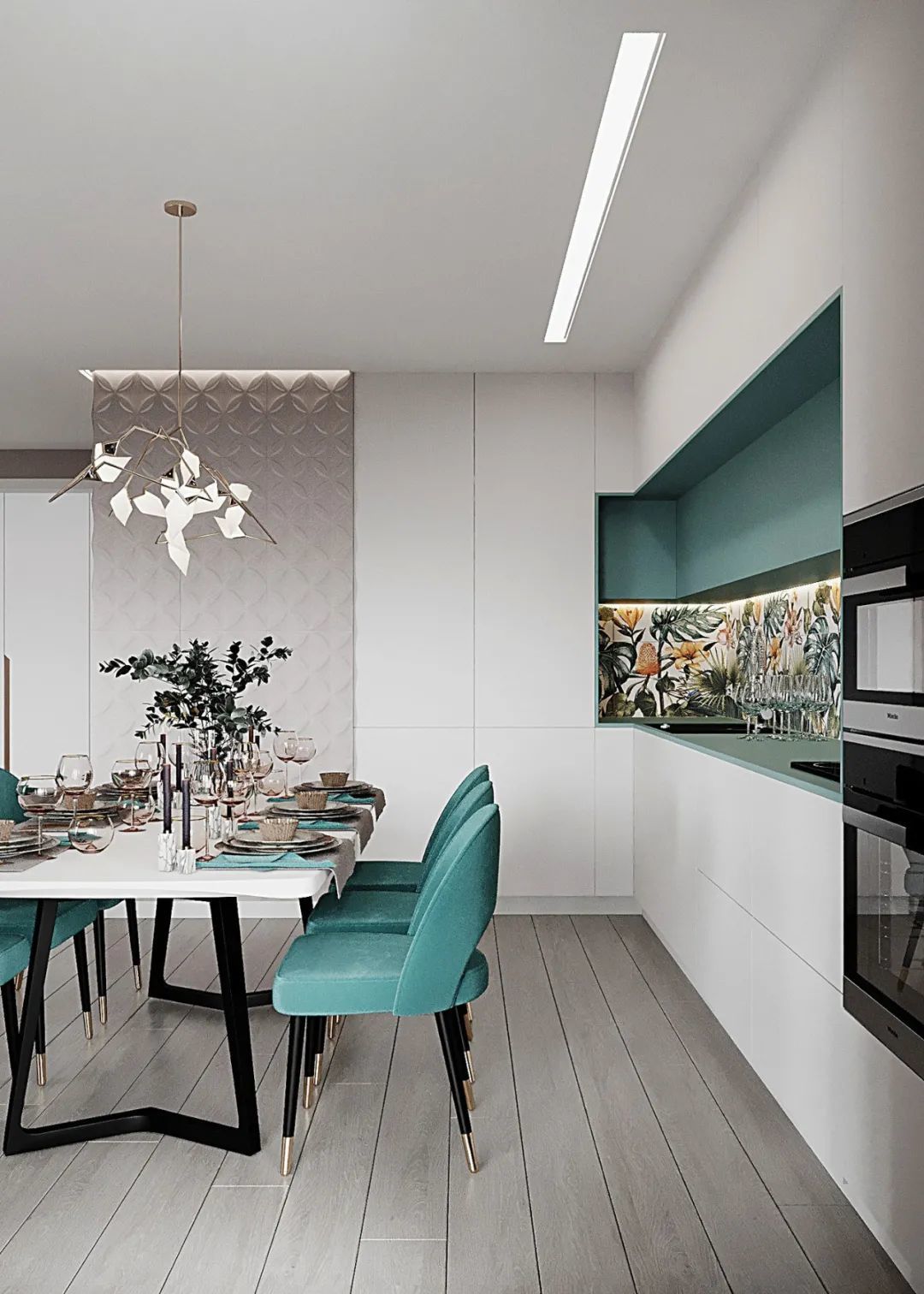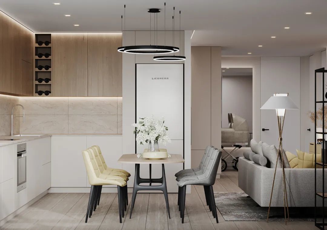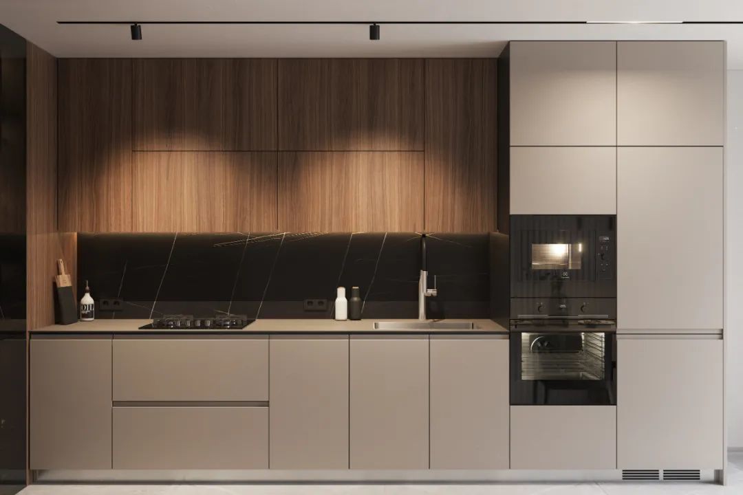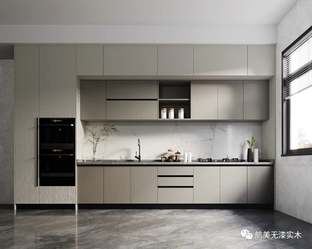 一字型落地橱柜,采用浅灰木纹的质感交融,无把手的简致立面,以及有序的线条呈现,带来了舒适而优雅的视觉传达。
