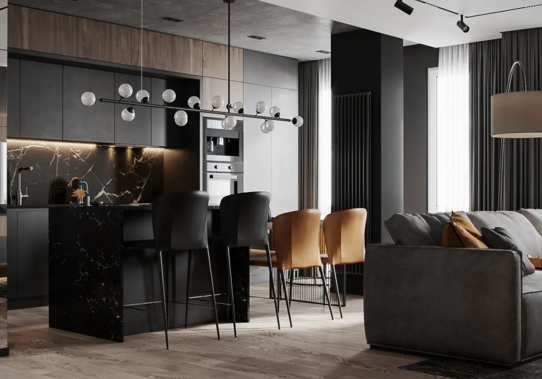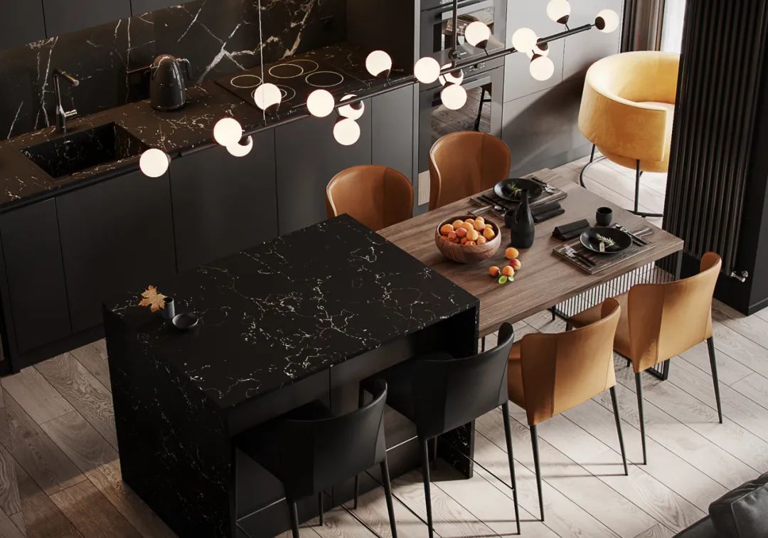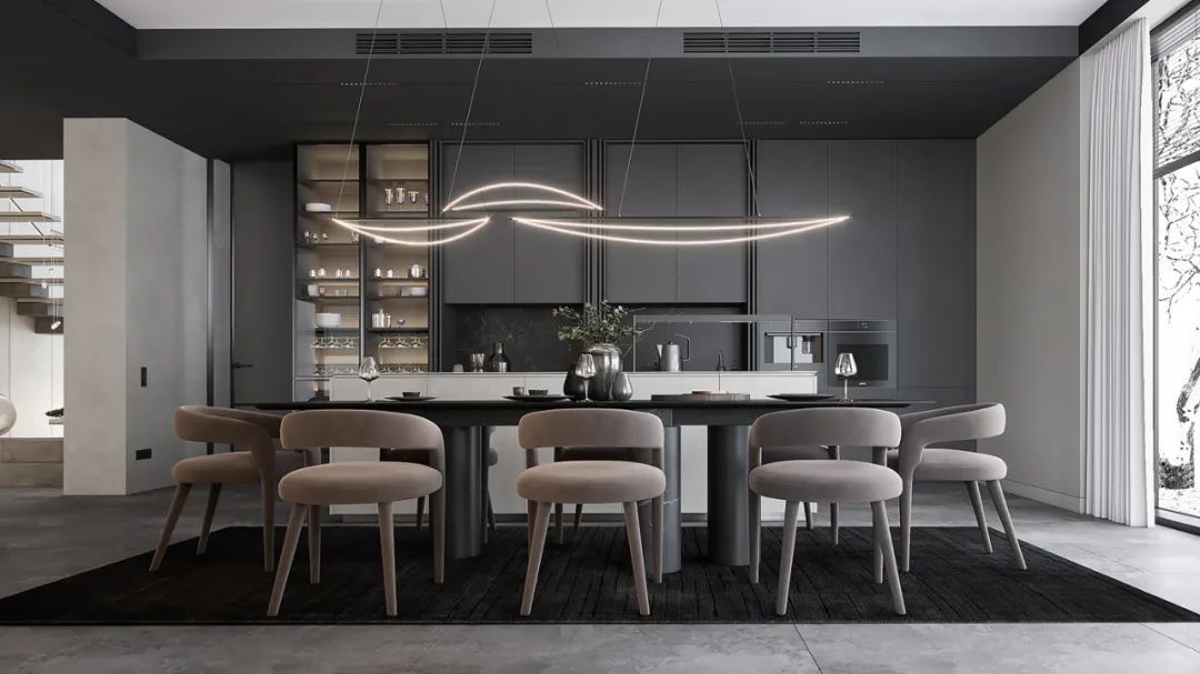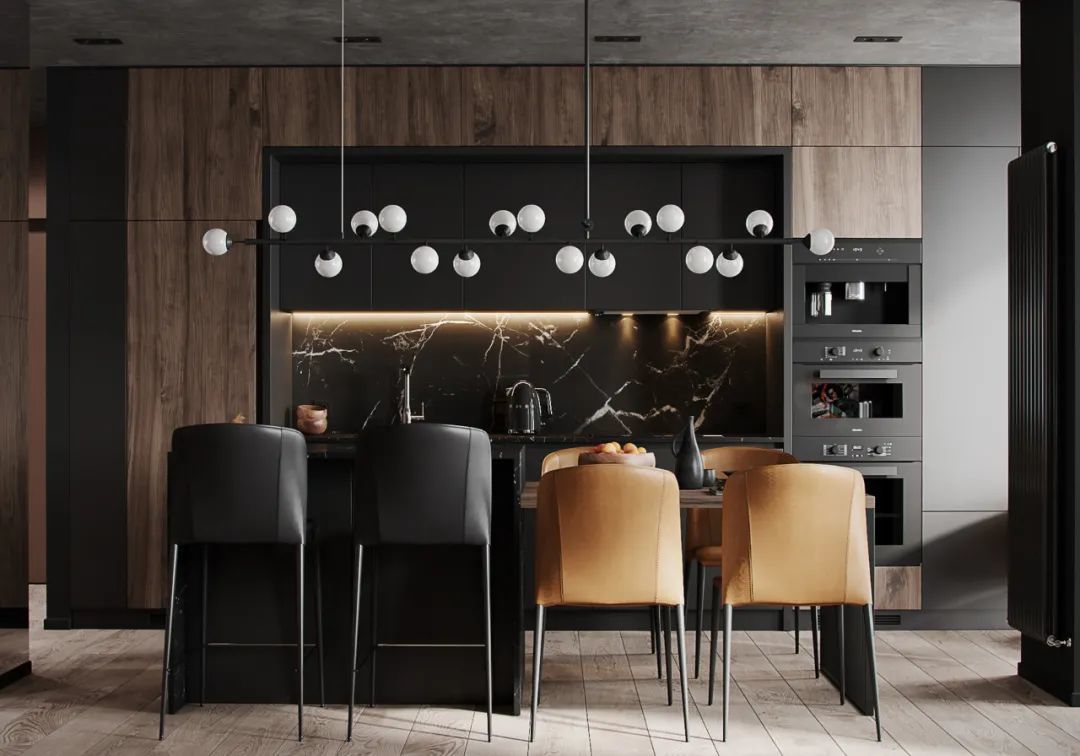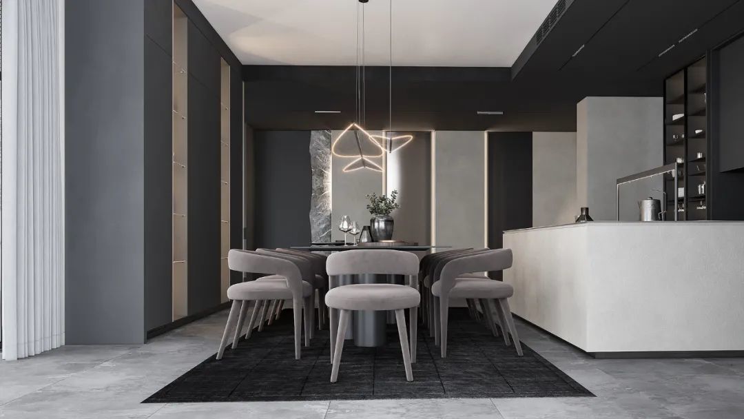 简奢厨房,从墙面到操作台、中岛台,视觉上起到连贯性与舒适感,将高贵气质表现得淋漓尽致,很好的平衡了奢华与功能。